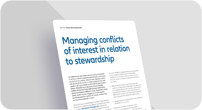 Managing conflicts of interest in relation to stewardship As a fiduciary to our clients, we have a duty at AllianzGI to act in our clients’ long-term best interests, and to never put the firm in a position where its own interests conflict with its duty to its clients, or where its duty to one client results in an irreconcilable conflict with its duty to other clients. AllianzGI has a regulatory duty to manage conflicts of interests fairly, both between itself and its clients and between different clients. Stewardship of our clients’ assets requires diligence in monitoring and identifying potential conflicts of interest, whether they are internal or external in nature. To ensure proper stewardship in our clients’ best interests, AllianzGI has implemented Global Corporate Governance Guidelines ( documents: allianzgi.com ), policies and procedures, and employee training designed to prevent perceived or actual conflicts of interest from constituting or giving rise to a material risk of damage to the interests of our clients. Examples of potential conflicts include (but are not limited to): 1. AllianzGI is owned by Allianz SE, a global insurance and financial group whose interests and views on particular matters may not always align with those AllianzGI considers best for our clients. To address the potential conflicts that could arise based on our relationship with our parent company, AllianzGI has imposed strict controls and information barriers designed to insulate our decision-making process from improper influence and to ensure that we are able to carry out our investment decisions and stewardship activities in a manner consistent with the interests of our clients. 2. The core business of AllianzGI is investment management - managing money and assets for our clients. Where a clients’ fund holds securities in a sponsor company, a perceived conflict of interest may arise if we exercised the proxy vote or engaged in topics on behalf of our client which may impact our own commercial interests or arrangements. This potential conflict will be mitigated by ceding the ultimate decision making on how and whether to engage with issuers or vote proxies to our investment platform which is intentionally insulated from our other business functions to ensure that such decisions are based solely on the interests of our clients. 3. AllianzGI may from time to time have clients that advocate a voting position with respect to a proxy vote on a company that we view to be inconsistent with the long-term best interests of other clients. To this end, AllianzGI has created a clear separation between the proxy voting and the client relationship functions. 4. We may invest in a company that is also a significant distributor of our products. Other potential conflicts of interest include: – An investee company that is also a client – An investee company where a director, officer or employee of AllianzGI is also a director of that company We have a dedicated governance structure and a set of policies and processes in place for managing conflicts of interest in proxy voting and engagement. An overview of this is provided below. Governance AllianzGI is managed and overseen by the Executive Committee (ExCo). With respect to all investment matters, the responsibility for ensuring our approach is designed to meet our obligations to our clients rests with the Investment Executive Committee (IEC), comprised of the firm’s senior investment leadership. The Compliance and Risk Management functions provide further governance oversight by regularly evaluating our processes and reviewing decisions to ensure that we have taken appropriate actions. The structure and business of AllianzGI are further described at: https://www.allianzgi.com/en/our-firm . AllianzGI Stewardship Statement 6