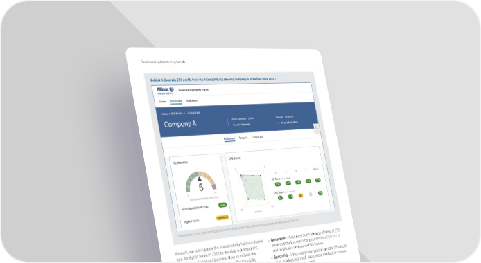 Sustainability data: turning the tide Exhibit 4: Example ESG profile from the AllianzGI SusIE showing Company A in the insurance sector Image taken from SusIE dashboard showing ESG screening and controversy scores across several factors. As such, we put in place the Sustainability Methodologies – Generalist – these provide a full range offering of ESG and Analytics team in 2021 to develop a transparent, services, including raw data, peer analysis, ESG scores robust, and digital architecture. Now launched, this and qualitative analysis on ESG factors. architecture is known as SusIE or our Sustainability – Specialist – a highly granular, specific or niche offering of Insights Engine. data, opinions (eg, small cap, private markets) or themes SusIE will support the delivery of ESG, sustainability and (eg, biodiversity, social impact) impact data – with accompanying perspectives and – Technology – providers using alternative data capture opinions – to our investment professionals. It involves techniques like artificial intelligence or natural language a robust approach to scoping data sources, efficient processing to offer a new range of services and analytics. aggregation of this data, and the population of this These can include forward-looking measures, fuller data into clear and commercial front office-facing tools. coverage of investable universes, news flow screens and SusIE is designed to support the introduction of new truly independent raw data sets. data, removal of redundant data, and alignment to new Positioned for an ESG technology-powered future client product offerings. An example is the new net zero The one constant in any form of technology is change alignment toolkit, scheduled for launch later in 2023. and we are readying ourselves for this. We currently How we scope data for SusIE identify three likely important elements of any evolution of data and how they can be embedded in a robust and We value the cognitive diversity of the different resilient ESG data strategy: approaches in the market, and this helps us avoid 1. Evolving data capture away from current reliance on unintended implicit biases in model outputs. But purchased data. New technologies will allow for more discipline is needed in how we treat the different sources, alternative and independent sources, capturing more and we separate data providers into three broad perspectives. A likely future hybrid model will see quality 11 categories raw data complemented by external expert opinions. 3