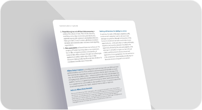Sustainability data: turning the tide 2. Powerful engines and efficient data processing to Nothing artificial about the intelligence outlook address the volume of data. This includes cleansing, In summary, the realm of ESG data is expanding swiftly matching, computing, transforming and distributing in volume and complexity. Investors will expect asset separate sources into consistent, standardised data sets. managers to guide them through the integration of ESG More granular E, S and G metrics will inform investment factors into investment decisions as well as the risk and decisions and asset allocation and meet client-reporting opportunity sets – at the same time as meeting challenging expectations. 3. Risk assessments will benefit from new techniques. The regulatory and reporting demands. We embrace the scraping of formal reporting suites is now mainstream, opportunity afforded by the scale and complexity of the but a fuller and more predictive understanding of data topic to demystify and guide our clients through material risks will be achieved through new technologies a likely eventful period of evolution in investment applied to an entity’s entire value chain. A fuller approaches. A strong proprietary ESG data architecture measure of idiosyncratic non-financial risks will allow for is the cornerstone in understanding and aligning non- investment diversification of these risks. financial outcomes alongside financial returns. Allianz Global Investors is a leading active asset manager with over 600 investment professionals in over 20 offices worldwide and managing EUR 506 billion in assets. We invest for the long term and seek to generate value for clients every step of the way. We do this by being active – in how we partner with clients and anticipate their changing needs, and build solutions based on capabilities across public and private markets. Our focus on protecting and enhancing our clients’ assets leads naturally to a commitment to sustainability to drive positive change. Our goal is to elevate the investment experience for clients, whatever their location or objectives. Active is: Allianz Global Investors Data as at 31 December 2022. Total assets under management are assets or securities portfolios, valued at current market value, for which Allianz Asset Management companies are responsible vis-á- vis clients for providing discretionary investment management decisions and portfolio management, either directly or via a sub-advisor. This excludes assets for which Allianz Asset Management companies are primarily responsible for administrative services only. Assets under management are managed on behalf of third parties as well as on behalf of the Allianz Group.
