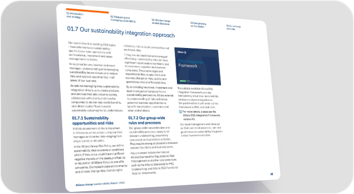 01 Introduction and strategy 02 Measuring and managing sustainability 03 Climate change related disclosure 04 Strengthening our foundation 05 Our universal principles 01.7 Our sustainability integration approach Our commitment to tackling ESG topics – here referred to as sustainability – applies to our own operations and our insurance, investment and asset management activities. As a global insurer, investor and asset manager, understanding and managing sustainability issues allows us to reduce risks and capture opportunities in all areas of our business. As well as managing risks, sustainability integration directs us to create products and services that add value to society, collaborate with clients and investee companies to deliver real-world benefits, and direct capital flows towards sustainable outcomes for all stakeholders. 01.7.1 Sustainability opportunities and risks Holistic assessment of risk is important to Allianz as an insurance company that manages and carries risks ranging from single events to decades. In the Allianz Group Risk Policy, we define sustainability risks as events or conditions which, if they occur, could have significant negative impacts on the assets, profitability or reputation of Allianz Group or one of its companies. Examples include environmental and climate change risks, human rights violations, risks to local communities and workforce risks. If they are not identified and managed effectively, sustainability risks can have significant repercussions for Allianz and its customers, suppliers and investee companies. These span legal and reputational risks, supply chain and business disruption risks, quality and operational risks and financial risks. By scrutinizing insurance, investment and asset management projects from a sustainability perspective, Allianz extends its understanding of risks and seizes potential business opportunities to benefit shareholders, customers and other stakeholders. 01.7.2 Our group-wide rules and processes Our group-wide corporate rules and sustainability processes apply to all relevant underwriting, proprietary investment and operations activities. They require strong collaboration between relevant functions and business areas. Key processes include the internal Allianz Standard for Reputational Risk Management and other corporate rules such as the Allianz Standards for P&C Underwriting and Allianz ESG Functional Rule for Investments. The publicly available Allianz ESG Integration Framework provides transparency around our sustainability- related processes and guidelines. We published the fourth version of the Framework in 2021, available here. For more details, please see the Allianz ESG Integration Framework, version 4.0. Our asset management units have set up their own set of pr ocesses, rules and governance on sustainability integration in their investment activities. 18 Allianz Group Sustainability Report 2022 ~ I.... 0 s: OJ @ E I N 0 i:: .!!! I.... ~ LL [f)