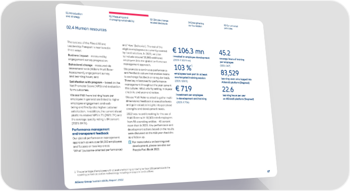 01 Introduction and strategy 02 Measuring and managing sustainability 03 Climate change related disclosure 04 Strengthening our foundation 05 Our universal principles 02.4 Human resources The success of the #lead Allianz Leadership Passport is monitored in three ways: Business impact – measured by engagement survey progression; Behavioral change – measured via assessment tools (Allianz Multi Rater Assessment), engagement survey, and learning hours; and Satisfaction with program – based on the Net Promoter Score (NPS) and evaluation form outcomes. We see that more training hours per employee in general are linked to higher employee engagement and well- being and finally also higher customer satisfaction. In addition, the current #lead platform related NPS is 71 (2021: 74) and the average quality rating is 84 percent (2021: 84 %). Performance management and transparent feedback Our global performance management approach covers over 84,000 employees and focuses on two key areas: ’What’ (outcome-oriented performance) and ‘How’ (behavior). The rest of the eligible employees are currently covered by local solutions. In 2023, we plan to include around 18,000 additional employees into the global performance management approach. We promote a continuous performance and feedback culture that enables teams to exchange feedback on a regular basis. Three key milestones for performance management throughout the year cement this culture: Initial priority setting, mid-year check-in, and year-end review. We use Multi Rater as a tool to gather multi- dimensional feedback at executive levels and gain valuable insights into perceived strengths and development needs. 2022 was record-breaking for the use of Multi Rater with 10,303 rated employees from 55 operating entities – 40 percent more than in 2021. Key performance and development actions based on the results were discussed at the mid-year check-ins as a follow-up. For more details on learning and development, please see also our People Fact Book 2022. € 106.3 mn invested in employee development (2021: € 102.9 mn) 103 % 1 employees took part in at least one targeted training session (2021: 103 %) € 719 investment per employee in development and training (2021: € 716) 45.2 average hours of training per employee (2021: 34.7) 83,529 learning users who logged into AllianzU platform (Degreed) 22.6 learning hours per user on AllianzU platform (Degreed) 1 The percentage of employees with at least one training can be higher than 100 percent due to the reporting period calculation methodology including employee in- and outflows. Allianz Group Sustainability Report 2022 67