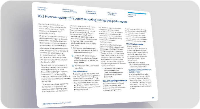01 Introduction and strategy 02 Measuring and managing sustainability 03 Climate change related disclosure 04 Strengthening our foundation 05 Our universal principles 05.2 How we report: transparent reporting, ratings and performance Our ambition is to increase trust and transparency in all our activities and we strive to reflect our values of integrity, competence and resilience in our sustainability reporting. We actively promote the development of global sustainability reporting standards to simplify the reporting landscape and drive transparency and comparability of corporate reporting and performance. Allianz bases its management approach and reporting on voluntary international standards and guidelines such as the Global Reporting Initiative (GRI) and recognized sustainability indices. This report complies with the latest GRI Standards from 2021. We continually monitor developments in reporting standards and regulations including initiatives by the World Economic Forum (WEF), the European Commission (EC), the Sustainability Accounting Standards Board (SASB) and the International Sustainability Standards Board (ISSB). Our engagement aims to support the development of a high-quality and globally consistent reporting system that adequately meets stakeholders’ information demands in a timely manner. For example, we are a member of the European Financial Reporting Advisory Group (EFRAG) Project Task Force on European Sustainability Reporting Standards (PTF-ESRS). Allianz will be required to comply with CSRD regulations by fiscal year 2024. To achieve this, a dedicated implementation project has been set up. Details on our reporting standards, scope and materiality can be found in this section and section 05.7. Our annual U.N. Global Compact (UNGC) Communication on Progress can be found on our website and the UNGC website. Our GRI Content Index is available on our website. Data and assurance To assess the quality and reliability of our reporting, PricewaterhouseCoopers GmbH Wirtschaf tsprüfungsgesellschaft (PwC) has conducted limited assurance reviews of our sustainability reports, processes and data since the 2016 reporting year and since 2021 reporting year for the Tax Transparency Report. PwC undertakes regular onsite reviews of a sample of oper ating entities of Allianz SE, selected based on their impact on the Group’s sustainability activities. Implementation of recommendations is monitored by the Global Sustainability and Group Accounting and Reporting functions. The Group center functions, the Group Disclosure Commit tee, and our operating entities support the Allianz SE Board of Management to ensure that the Group Management Report and Sustainability Report (which includes our non-financial statement) includes a fair review of the development and performance of the business and the position of the group. The Supervisory Board also reviewed and approved both reports. Please see the 2022 Independent Practitioner’s Report on a Limited Assurance Engagement on Sustainability Information (section 05.8). 05.2.1 Reporting parameters The content of this report is focused on the key requirements of our stakeholders and sustainability rating and benchmarking providers. The primary target audience are rating providers, anal ysts, investors and NGOs. The report also contains key insights for other stakeholder groups, such as customers and employees, and makes links to other documents which disclose our approach and report on progress. Material topics and aspects Key topics included in this Sustainability Report were shaped by our 2021 materiality analysis which satisfies the GRI Principles for defining report content (accuracy, balance, clarity, comparability, completeness, sustainability context, timeliness and verifiability). For further details about our 2021 materiality assessment process and outcomes, see section 05.7. World Economic Forum Stakeholder Capitalism Metrics Since January 2021, Allianz has been one of the initial endorsing companies of the (WEF) Stakeholder Capitalism Metrics. Drawn from existing standards, the Stakeholder Capitalism Metrics are a set of metrics that can be reported on by all companies, regardless of industry or region. Allianz Group Sustainability Report 2022 142