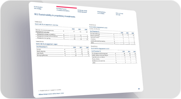 01 Introduction and strategy 02 Measuring and managing sustainability 03 Climate change related disclosure 04 Strengthening our foundation 05 Our universal principles 02.2 Sustainability in proprietary investments Table ESG-9 Sustainability engagement: overview 2022 2021 2020 Number of active engagements # 57 61 68 Engagement outcomes Engagement closed successfully # 2 21 3 Engagement closed with restrictions # 0 2 8 Engagement on-going # 55 38 57 Table ESG-10 Sustainability engagement: region As of December 31 2022 2021 2020 Europe # 12 15 17 North America # 20 17 20 Asia Pacific # 6 22 25 Emerging Markets # 19 7 6 Table ESG-11 Sustainability engagement: sector number of referrals As of December 31 2022 2021 2020 Oil, Gas and Energy # 40 34 36 Metals and Mining # 4 7 6 Steel and Cement # 5 7 6 Chemicals # 2 3 5 Construction and Engineering # 3 5 8 Other # 3 5 7 Table ESG-12 Sustainability engagement: topics 1 As of December 31 2022 2021 2020 CO 2 Emissions and Management # 48 48 49 Health, Safety and Human Rights # 10 17 17 Toxic Emissions and Waste # 4 6 8 Product Safety # 1 2 3 Biodiversity and Land Use # 3 4 4 Other # 4 3 9 1 Multiple topics per engagement possible. Allianz Group Sustainability Report 2022 42