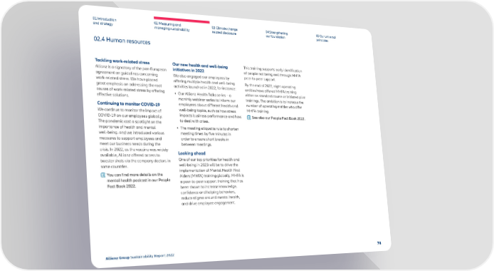 01 Introduction and strategy 02 Measuring and managing sustainability 03 Climate change related disclosure 04 Strengthening our foundation 05 Our universal principles 02.4 Human resources Tackling work-related stress Allianz is a signatory of the pan-European agreement on guidelines concerning work-related stress. We have placed great emphasis on addressing the root causes of work-related stress by offering effective solutions. Continuing to monitor COVID-19 We continue to monitor the impact of COVID-19 on our employees globally. The pandemic cast a spotlight on the importance of health and mental well-being, and we introduced various measures to support employees and meet our business needs during the crisis. In 2022, as the vaccine was widely available, Allianz offered access to booster shots via the company doctors in some countries. You can find more details on the mental health podcast in our People Fact Book 2022. Our new health and well-being initiatives in 2022 We also engaged our employees by offering multiple health and well-being activities launched in 2022, for instance: • Our Allianz Health Talks series – a monthly webinar series to inform our employees about different health and well-being topics, such as how stress impacts business performance and how to deal with crises. • The meeting etiquette rule to shorten meeting times by five minutes in order to ensure short breaks in between meetings. Looking ahead One of our top priorities for health and well-being in 2023 will be to drive the implementation of Mental Health First Aiders (MHFA) training globally. MHFA is a peer-to-peer support training that has been shown to increase knowledge, confidence and helping behaviors, reduce stigma around mental health, and drive employee engagement. This training supports early identification of people not being well through MHFA peer-to-peer support. By the end of 2022, eight operating entities have offered MHFA training either as standard course or initiated pilot trainings. The ambition is to increase the number of operating entities who offer MHFA-training. See also our People Fact Book 2022. Allianz Group Sustainability Report 2022 74