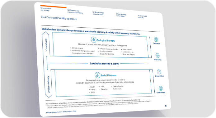 01 Introduction and strategy 02 Measuring and managing sustainability 03 Climate change related disclosure 04 Strengthening our foundation 05 Our universal principles 01.4 Our sustainability approach Stakeholders demand change towards a sustainable economy & society within planetary boundaries Sustainable economy & society Overshoot Ecological Barriers Overuse of natural resources, possibly leading to tipping points • Climate change • Freshwater change: green water • Stratospheric ozone depletion • Atmospheric aerosol loading • Ocean acidification • Biogeochemical cycle • Novel entities * • Land system use • Biosphere integrity Customers Employees Under-delivery Social Minimum Resources that a person needs in order to lead a minimally decent life in their society; examples showcasing a broad scale • Health • Energy • Water • Food • Education • Gender Equality • Social equity Shareholders Governments The model does not reflect Allianz. Source: Planetary boundaries – Stockholm Resilience Centre , Doughnut | Kate Raworth , Home | Sustainable Development (un.org) . * The novel entities boundary in the planetary boundaries framework refers to entities that are novel in a geological sense and that could have large-scale impacts that threaten the integrity of E arth system processes. Source: Outside the Safe Operating Space of the Planetary Boundary for Novel Entities | Environmental Science & Technology (acs.org) . 11 Allianz Group Sustainability Report 2022 'I' •v @ @ ~ ©