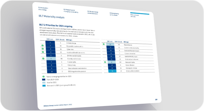 01 Introduction and strategy 02 Measuring and managing sustainability 03 Climate change related disclosur e 04 Strengthening our foundation 05 Our univ ersal principles 05.7 Materiality analysis 05.7.2 Priorities for 2021 ongoing While all material ESG topics are important to address, several topics have risen or emerged as potentially new priorities for the next one to two years until the next assessment takes place. The full list of material topics assessed in 2021, which are considered still relevant and material for 2022, include: 2021 rank 2019–20 rank ESG topic 1 1 Climate change 2 11 Responsible business ethics 3 12 Cyber risks 4 15 Health and healthcare access 5 3 Environmental impacts 6 NR Diversity and inclusion 7 5 Human rights 8 9 Data privacy 9 4 Talent attraction and retention 10 2 ESG integration into products 2021 rank 2019–20 rank ESG topic 11 NR Responsible tax 12 13 Customer and product safety 13 6 Social and financial inclusion 14 7 Customer innovation 15 17 Local community impact 16 10 Social and political unrest 17 NR Data and AI ethics 18 8 Natural disasters 19 16 Demographic change 20 14 Animal welfare standards New or emerging priorities for 2021 From 2019–2020 New for 2021 Removed in 2021 (peer group feedback) • - - ------- - - --------- · - -- - - --------- · - - - --------- · - - - --------- - - - - --------- • • - - - - --------- - - - - --------- - - - - --------- - - --------- • - - - 159 Allianz Group Sustainability Report 2022