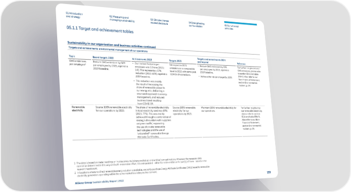 01 Introduction and strategy 02 Measuring and managing sustainability 03 Climate change related disclosure 04 Strengthening our foundation 05 Our universal principles 05.1.1 Target and achievement tables Sustainability in our organization and business activities continued Targets and achievements: environmental management of our operations Topic Board targets 2022 Achievements 2022 Targets 2023 Targets and commitments 2024 and beyond Reference GHG emissions per employee 1 Reduce GHG emissions by 50% per employee by 2025, against a 2019 baseline. • Our carbon footprint per employee was 1.0 tons (2021: 0.9). This represents a 57% reduction (2021: 60%), against a 2019 baseline. • This reduction was mainly the result of increasing the share of renewable power in our energy mix, delivering a structured approach to energy management, and reduced business travel resulting from COVID-19. We expect in 2023 emissions on a comparable level to 2022 with some post COVID-19 corrections. • Reduce GHG emissions by 50% per employee by 2025, against a 2019 baseline. • Achieve the net-zero target by 2030. For further insights into our GHG emissions, please refer to section 02.6 and table ENV-2. Also refer to our Non-Financial Statement, section Environmental matters, p. 64. Renewable electricity Source 100% renewable electricity for our operations by 2023. The share of renewable electricity in total electricity used was 89% (2021: 77%). This was mainly achieved through a combination of strategic discussions with suppliers on’green tariffs’, expanding the use of on-site renewable technologies and the use of ‘unbundled’ 2 renewable Energy Attribute Certificates. Source 100% renewable electricity for our oper ations by 2023. Maintain 100% renewable electricity for our operations. For further insights into our renewable electricity, please refer to section 02.6 and table ENV-5. Also refer to our Non- Financial Statement, section Environmental matters, p. 64. 1 The data is based on meter readings or invoice amounts (where available), and entities’ own estimations. Wherever the necessary data cannot be determined in this way and with reasonable effort, it is extrapolated – either for entire entities or for part(s) of them – based on the relevant headcount. 2 In locations where no direct renewable energy solution is available, we partly purchase Energy Attribute Certificates (EACs) issued to renewable electricity generators operating within the same market boundary as the claimant. Allianz Group Sustainability Report 2022 133