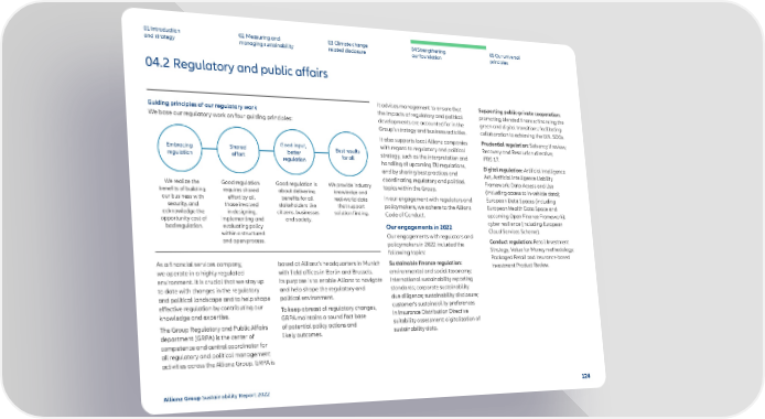 01 Introduction and strategy 02 Measuring and managing sustainability 03 Climate change related disclosure 04 Strengthening our foundation 05 Our universal principles 04.2 Regulatory and public affairs Guiding principles of our regulatory work We base our regulatory work on four guiding principles: Embracing regulation We realize the benefits of building our business with security, and acknowledge the opportunity cost of bad regulation. Shared effort Good regulation requires shared effort by all those involved in designing, implementing and evaluating policy within a structured and open process. Good input, better regulation Good regulation is ab out delivering benefits for all stak eholders like citizens, businesses and society. Best results for all We provide industry knowledge and real-world data that support solution finding. As a financial services company, we operate in a highly regulated environment. It is crucial that we stay up to date with changes in the regulatory and political landscape and to help shape effective regulation by contributing our knowledge and expertise. The Group Regulatory and Public Affairs department (GRPA) is the center of competence and central coordinator for all regulatory and political management activities across the Allianz Group. GRPA is based at Allianz’s headquarters in Munich with field offices in Berlin and Brussels. Its purpose is to enable Allianz to navigate and help shape the regulatory and political environment. To keep abreast of regulatory changes, GRPA maintains a sound fact base of potential policy actions and likely outcomes. It advises management to ensure that the impacts of regulatory and political developments are accounted for in the Group’s strategy and business activities. It also supports local Allianz companies with regard to regulatory and politic al strategy, such as the interpretation and handling of upcoming EU regulations, and by sharing best practices and coordinating regulatory and political topics within the Group. In our engagement with regulators and policymakers, we adhere to the Allianz Code of Conduct. Our engagements in 2022 Our engagements with regulators and policymakers in 2022 included the following topics: Sustainable finance regulation: environmental and social taxonomy; international sustainability reporting standards; corporate sustainability due diligence; sustainability disclosure; customer’s sustainability preferences in Insurance Distribution Directive suitability assessment; digitalization of sustainability data. Supporting public-private cooperation: promoting blended finance; financing the green and digital transitions; facilitating collaboration to achieving the U.N. SDGs. Prudential regulation: Solvency II review; Recovery and Resolution directive; IFRS 17. Digital regulation: Artificial Intelligence Act, Artificial Intelligence Liability Framework; Data Access and Use (including access to in-vehicle data); European Data Spaces (including European Health Data Space and upcoming Open Finance Framework); cyber resilience (including European Cloud Services Scheme). Conduct regulation: Retail Investment Strategy; Value for Money methodology; Packaged Retail and Insurance-based Investment Product Review. Allianz Group Sustainability Report 2022 124