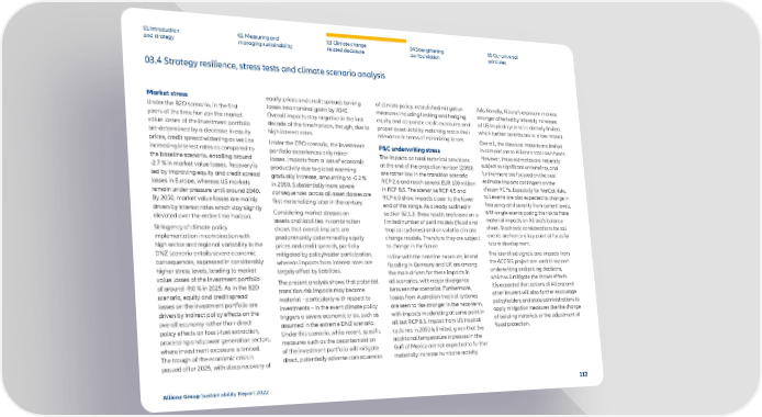 03.4 Strategy resilience, stress tests and climate scenario analysis 01 Introduction and strategy 02 Measuring and managing sustainability 03 Climate change related disclosure 04 Strengthening our foundation 05 Our universal principles Market stress Under the B2D scenario, in the first years of the time horizon the market value losses of the investment portfolio are determined by a decrease in equity prices, credit spread widening as well as increasing interest rates as compared to the baseline scenario, entailing around -2.7 % in market value losses. Recovery is led by improving equity and credit spread losses in Europe, whereas US markets remain under pressure until around 2040. By 2050, market value losses are mainly driven by interest rates which stay slightly elevated over the entire time horizon. Stringency of climate policy implementation in combination with high sector and regional variability in the DNZ scenario entails severe economic consequences, expressed in considerably higher stress levels, leading to market value losses of the investment portfolio of around -9.0 % in 2025. As in the B2D scenario, equity and credit spread losses on the investment portfolio are driven by indirect policy effects on the overall economy rather than direct policy effects on fossil-fuel extraction, processing and power generation sectors, where investment exposure is limited. The trough of the economic crisis is passed after 2025, with steep recovery of equity prices and credit spreads turning losses into nominal gains by 2040. Overall impacts stay negative in the last decade of the time horizon, though, due to high interest rates. Under the CPO scenario, the investment portfolio experiences only minor losses. Impacts from a loss of economic productivity due to global warming gradually increase, amounting to -0.2 % in 2050. Substantially more severe consequences across all asset classes are first materializing later in the century. Considering market stresses on assets and liabilities in combination shows that overall impacts are predominantly determined by equity prices and credit spreads, partially mitigated by policyholder participation, whereas impacts from interest rates are largely offset by liabilities. The present analysis shows that potential transition risk impacts may become material – particularly with respect to investments – in the event climate policy triggers a severe economic crisis, such as assumed in the extreme DNZ scenario. Under this scenario, while recent, specific measures such as the decarbonization of the investment portfolio will mitigate direct, potentially adverse consequences of climate policy, established mitigation measures including limiting and hedging equity and corporate credit exposures and proper asset-liability matching retain their relevance in terms of minimizing losses. P&C underwriting stress The impacts on total technical provisions at the end of the projection horizon (2050) are rather low in the transition scenario RCP 2.6 and reach several EUR 100 million in RCP 8.5. The scenarios RCP 4.5 and RCP 6.0 show impacts closer to the lower end of this range. As already outlined in section 02.1.3 , these results are based on a limited number of peril models (flood and tropical cyclones) and on volatile climate change models. Therefore they are subject to change in the future. In line with the baseline exposure, inland flooding in Germany and UK are among the main drivers for these impacts in all scenarios, with major divergence between the scenarios. Furthermore, losses from Australian tropical cyclones are seen to rise stronger in the near-term, with impacts moderating at some point in all but RCP 8.5. Impact from US tropical cyclones in 2050 is limited, given that the additional temperature increases in the Gulf of Mexico are not expected to further materially increase hurricane activity. Additionally, Allianz’s exposure in areas stronger affected by intensity increases of US tropical cyclones is already limited, which further contributes to a low impact. Overall, the absolute impacts are limited in comparison to Allianz’s total own funds. However, these estimates are naturally subject to significant uncertainty, and furthermore are focused on the best estimate impacts contingent on the chosen RCPs. Especially for NatCat risks, tail events are also expected to change in frequency and severity from current levels, with single events posing the risk to have material impacts on Allianz’s balance sheet. Stochastic considerations for tail events are hence a key point of focus for future development. The identified signals and impacts from the ACCRiS project are used to support underwriting and pricing decisions, which will mitigate the shown effects. It is expected that actions of Allianz and other insurers will also further encourage policyholders and state administrations to apply mitigation measures like the change of building materials or the adjustment of flood protection. Allianz Group Sustainability Report 2022 112