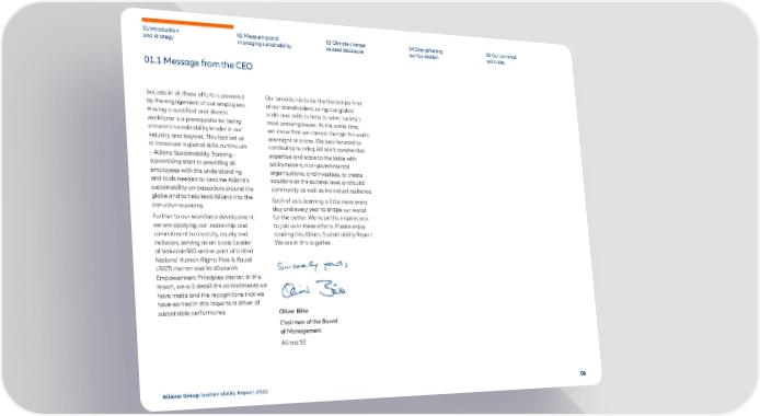 01 Introduction and strategy 02 Measuring and managing sustainability 03 Climate change related disclosure 04 Strengthening our foundation 05 Our universal principles Success in all these efforts is powered by the engagement of our employees. Having a qualified and diverse workforce is a prerequisite for being a trusted sustainability leader in our industry and beyond. This fact led us to introduce a global skills curriculum – Allianz Sustainability Training – a promising start to providing all employees with the understanding and tools needed to become Allianz’s sustainability ambassadors around the globe and to help lead Allianz into the transition economy. Further to our workforce development, we are applying our leadership and commitment to diversity, equity and inclusion, serving as an Iconic Leader of Valuable500 and as part of United Nations’ Human Rights Free & Equal LBGTI charter and its Women’s Empowerment Principles charter. In this report, we will detail the commitments we have made and the recognitions that we have earned in this important driver of sustainable performance. Our ambition is to be the trusted partner of our stakeholders, using our global scale and skills to help to solve society’s most pressing issues. At the same time, we know that we cannot change the world overnight or alone. We look forward to continuing to bring Allianz’s commercial expertise and scale to the table with policymakers, non-governmental organizations, and investees, to create solutions at the societal level and build community as well as individual resilience. Each of us is learning a little more every day and every year to shape our world for the better. We hope this inspires you to join us in these efforts. Please enjoy reading this Allianz Sustainability Report. We are in this together. Sincerely yours, Oliver Bäte Chairman of the Board of Management Allianz SE 01.1 Message from the CEO 06 Allianz Group Sustainability Report 2022