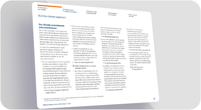01 Introduction and strategy 02 Measuring and managing sustainability 03 Climate change related disclosure 04 Strengthening our foundation 05 Our universal principles Our climate commitments and contributions Our climate approach is an integral part of our core business. By committing to net- zero greenhouse gas (GHG) emissions by 2050, we are working to set long-term and intermediate targets across our operations and business lines in line with the 1.5°C ambition 1 of the Paris Climate Agreement. In view of our overall goal to create positive change for societies and economies, we will continue to integrate climate action across all business areas and markets to deliver on our net- zero commitments. • For our proprietary investment portfolio, we have committed to reduce GHG emissions to net-zero by 2050. Our intermediate 2025 targets initially covered listed equities, corporate bonds and real estate. We are constantly expanding the scope of targets in line with the Target Setting Protocol of the Net-Zero Asset Owner Alliance (NZAOA), of which Allianz was one of the founding organizations and holds the Chair. The initiative is led by the U.N. For full list of targets, please see section 02.2.2. 01.5 Our climate approach • For our insurance portfolio, we were one of the founding members of the Net-Zero Insurance Alliance (NZIA). We are working on the targets and methodologies within the NZIA. These methodologies were published in January 2023 and Allianz and other members will now set their first near- term targets. The initiative is led by the U.N. • In 2022, we published our new approach for the oil and gas sector, including targeted restrictions for oil and gas projects and unconventional practices, as well as expectations for companies in this sector. Find out more in section 03.2. Allianz statement on oil and gas business models. • We continue to gradually phase out coal-based business models across our proprietary investments and P&C portfolios, with a 2040 deadline at the latest. The milestones for this phase-out have been derived from leading climate scenarios which keep global warming by the end of this century to 1.5°C with limited temperature overshoot. The next step is the tightening of the exclusion threshold for coal-based business mo dels to 25 percent by December 31, 2022. For details see section 03.2. • For our own operations, we announced the acceleration of climate targets with reduction of GHG emissions by 50 % by 2025, versus 2019, and net-zero by 2030. We plan to achieve these targets by strengthening our environmental management and sourcing 100 % renewable electricity by 2023, shifting to electric corporate car fleet by 2030, and reducing GHG emissions from travel activities by 40 % by 2025. For details see section 02.6. • In addition, we advocate for strong climate policy. A supportive policy environment is crucial to ensure the viability of a socially-just transition to climate resilience and net-zero emissions. Without decisive action by governments, there will be insufficient frameworks and market incentives to bring down demand for emission- intensive products and to allocate capital in line with a 1.5°C trajectory. For details see section 03.2. • As part of our commitment to transparency, we apply the recommendations of the G20 Financial Stability Board’s Task Force on Climate- related Financial Disclosures (TCFD). We strive to continuously enhance our climate change-related reporting and business practices to drive best practice and we collaborate with and support others to do the same. For more information, see chapter 03. • In the fight against global warming, any additional unit of renewable energy is needed. Therefore, we are revising our thermal coal guideline to allow ring- fenced insurance of renewable energy projects not looking at legacy business of the utility. Find out more in our Energy guidelines. 1 We are managing towards 1.5°C in line with pathways which do not overshoot 1.5°C or only to a limited extent (so called low/no overshoot pathways). 13 Allianz Group Sustainability Report 2022 > > > > >