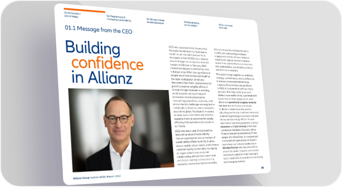 01 Introduction and strategy 02 Measuring and managing sustainability 03 Climate change related disclosure 04 Strengthening our foundation 05 Our universal principles 01.1 Message from the CEO Building confidence in Allianz 2022 was supposed to be the year that the world would return to “business as usual,” as we started to recover from the depths of the COVID-crisis. Instead, new challenges to society mounted: the invasion of Ukraine in February 2022 created the biggest humanitarian crisis in Europe since WWII, forcing millions of people out of their homes and inspiring the rapid mobilization of will and resources to help them. Global economic growth slowed as tangible effects of climate change increased: a warming world experienced more frequent and severe natural catastrophes. Intersecting geopolitical, economic, and environmental challenges are weighed on individuals, institutions, and communities around the globe. Polarization in society became more entrenched and linked to negative financial outcomes for people, affecting their optimism and outlook on our future. 2022 was also a year that proved the r esounding value of sustainability. How an organization acts on matters of sustainability affects its ability to grow, access capital, attract talent, and enhance customer loyalty. Sustainably managing an organization’s resources and collaborating with partners earns trust and fosters stability in times of social, economic, and environmental volatility. Allianz’s strong financial performance in 2022, our outstanding emplo yee engagement results, and our status as Interbrand’s highest-ranked insurance brand in the world reflects our resonance with stakeholders, our reliability, and our resilience as a company. This report brings together our ambition, str ategy, commitments, and contributions to shape a more sustainable future. It details the work done across Allianz in 2022, in collaboration with our many partners, that helps build, grow, and protect more resilient lives, businesses and economies. In these pages, you’ll read about our operational progress towards net-zero and our business strategies to deliver climate solutions, such as adjusting our thermal coal investment and underwriting strategy to be more inclusive of low-carbon energy efforts. You will learn about our many programs to bring education and job training to the most vulnerable members of society, with a focus on preparing talented youth and people with disabilities for employment in a transitioning economy. And you’ll read about our industry leadership in blended finance and how we use it to unlock the power of public and private investment capital at scale, helping to build sustainable economies in developing and emerging markets. 05 Allianz Group Sustainability Report 2022