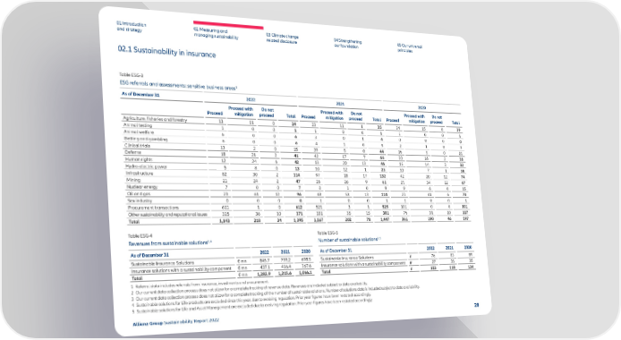 01 Introduction and strategy 02 Measuring and managing sustainability 03 Climate change related disclosure 04 Strengthening our foundation 05 Our universal principles Table ESG-3 ESG referrals and assessments: sensitive business areas 1 As of December 31 2022 2021 2020 Proceed Proceed with mitigation Do not proceed Total Proceed Proceed with mitigation Do not proceed Total Proceed Proceed with mitigation Do not proceed Total Agriculture, fisheries and forestry 13 11 0 24 23 11 1 35 24 15 0 39 Animal testing 1 0 0 1 1 0 0 1 1 0 0 1 Animal welfare 6 0 0 6 3 0 1 4 0 0 0 0 Betting and gambling 6 0 0 6 4 1 0 5 2 1 0 3 Clinical trials 13 2 0 15 39 5 0 44 16 5 0 21 Defense 18 21 2 41 42 17 7 66 20 16 2 38 Human rights 12 24 6 42 13 20 13 46 15 14 3 32 Hydro-electric power 5 8 0 13 10 12 1 23 10 7 1 18 Infrastructure 82 30 2 114 97 18 17 132 42 20 12 74 Mining 21 24 2 47 26 26 9 61 21 34 12 67 Nuclear energy 7 0 0 7 8 1 0 9 9 6 0 15 Oil and gas 23 61 12 96 48 53 13 114 23 41 6 70 Sex industry 0 0 0 0 1 0 0 1 1 0 0 1 Procurement transactions 611 1 0 612 521 3 1 525 101 0 0 101 Other sustainability and reputational issues 325 36 10 371 331 35 15 381 76 31 10 117 Total 1,143 218 34 1,395 1,167 202 78 1,447 361 190 46 597 02.1 Sustainability in insurance Table ESG-4 Revenues from sustainable solutions 2 , 4 As of December 31 2022 2021 2020 Sustainable Insurance Solutions € mn 845.7 799.2 698.5 Insurance solutions with a sustainability component € mn 437.1 416.4 367.6 Total € mn 1,282.9 1,215.6 1,066.1 Table ESG-5 Number of sustainable solutions 3 , 5 As of December 31 2022 2021 2020 Sustainable Insurance Solutions # 76 83 89 Insurance solutions with a sustainability component # 27 35 35 Total # 103 118 124 1 Referral data includes referrals from insurance, investments and procurement. 2 Our current data collection process does not allow for a complete tracking of revenue data. Revenues are included subject to data availability. 3 Our current data collection process does not allow for a complete tracking of the number of sustainable solutions. Number of solutions data is included subject to data availability. 4 Sustainable solutions for Life products are excluded since this year, due to evolving regulation. Prior year figures have been restated accordingly. 5 Sustainable solutions for Life and Asset Management are excluded due to evolving regulation. Prior year figures have been restated accordingly. Allianz Group Sustainability Report 2022 28