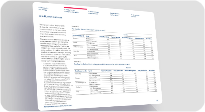01 Introduction and strategy 02 Measuring and managing sustainability 03 Climate change related disclosure 04 Strengthening our foundation 05 Our universal principles 02.4 Human resources The metrics in tables HR-17 and HR- 18 show the ratio of women to men for a) base salary and b) base salary plus variable compensation paid out, respectively by location of operation, level, and function. The ratios indicate differences in average salary between women and men within each employee category irrespective of the specific role or seniority. If within one category one gender predominates in the senior positions, this will be reflected in the genders’ remuneration averages, resulting in ratios below or above one in the tables. This has no bearing on Equal Pay for women and men performing the same or similar work in comparable roles. Table HR-17 Pay Equality: Ratios of basic salary (women to men) 1 Function As of December 31 Level Central Functions Product Provider Market Management Sales/Distribution Operations Germany Management 0.9 0.8 n/a 2 0.9 1.0 Non-management 1.1 0.9 0.8 0.9 0.9 France Management 0.8 0.8 0.7 1.0 1.0 Non-management 0.9 0.9 1.1 0.9 0.9 United Kingdom Management 0.7 0.9 0.9 0.9 0.8 Non-management 0.9 0.9 0.9 0.9 0.9 Australia Management 1.0 1.1 1.0 0.9 0.8 Non-management 0.9 0.8 0.9 0.9 0.9 Italy Management 0.7 0.9 1.2 0.8 0.7 Non-management 0.9 0.9 0.9 0.8 0.9 Table HR-18 Pay Equality: Ratios of basic salary plus variable compensation paid out (women to men) Function As of December 31 Level Central Functions Product Provider Market Management Sales/Distribution Operations Germany Management 0.8 0.7 n/a 2 0.9 0.9 Non-management 1.1 0.9 0.8 0.8 0.9 France Management 0.7 0.7 0.5 0.9 1.1 Non-management 0.9 0.9 1.1 0.8 0.9 United Kingdom Management 0.7 0.9 0.9 0.9 0.8 Non-management 0.9 0.9 0.9 0.9 0.9 Australia Management 1.1 1.3 1.1 0.9 0.8 Non-management 0.9 0.8 0.9 0.9 0.9 Italy Management 0.6 0.7 0.9 0.7 0.8 Non-management 0.9 0.9 0.9 0.8 0.9 1 The analysis is based on salary data as of 31 December 2022 and comprises our significant locations of operation. For this analysis, we define significant locations of operation as the five largest company groups in terms of active headcount excluding global lines. The following companies were in scope, comprising 29 % of Allianz’s global active headcount: Allianz Australia: Allianz Australia Ltd., Sydney (91 % of company group’s active headcount), Allianz France: Allianz Vie S.A., Allianz Informatique France (94 % of company group’s active headcount), Allianz Germany: Allianz Versicherungs-AG, Allianz Beratungs- und Vertriebs-AG, Allianz Lebensversicherungs- AG, Allianz Private Krankenversicherungs-AG, Allianz ONE (93 % of company group’s active headcount), Allianz Italy: Allianz S.p.A. (75 % company group’s active headcount), Allianz United Kingdom: Allianz Management Services Ltd., Liverpool Victoria Gen. Ins. Ltd., Fairmead Ins, Home & Legacy Ins Services Ltd (100 % of company group’s active headcount). 2 There are no women in this category. Allianz Group Sustainability Report 2022 62