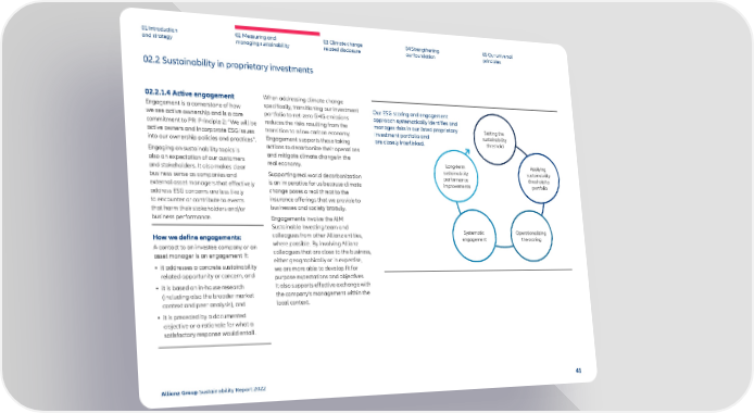 02.2 Sustainability in proprietary investments 01 Introduction and strategy 02 Measuring and managing sustainability 03 Climate change related disclosure 04 Strengthening our foundation 05 Our universal principles 02.2.1.4 Active engagement Engagement is a cornerstone of how we see active ownership and is a core commitment to PRI Principle 2: “We will be active owners and incorporate ESG issues into our ownership policies and practices”. Engaging on sustainability topics is also an expectation of our customers and stakeholders. It also makes clear business sense as companies and external asset managers that effectively address ESG concerns are less likely to encounter or contribute to events that harm their stakeholders and/or business performance. How we define engagements: A contact to an investee company or an asset manager is an engagement if: • it addresses a concrete sustainability related opportunity or concern, and • it is based on in-house research (including also the broader market context and peer analysis), and • it is preceded by a documented objective or a rationale for what a satisfactory response would entail. When addressing climate change specifically, transitioning our investment portfolio to net-zero GHG emissions reduces the risks resulting from the transition to a low carbon economy. Engagement supports those taking actions to decarbonize their operations and mitigate climate change in the real economy. Supporting real world decarbonization is an imperative for us because climate change poses a real threat to the insurance offerings that we provide to businesses and society broadly. Engagements involve the AIM Sustainable Investing team and colleagues from other Allianz entities, where possible. By involving Allianz colleagues that are close to the business, either geographically or in expertise, we are more able to develop fit for purpose expectations and objectives. It also supports effective exchange with the company’s management within the local context. Our ESG scoring and engagement approach systematically identifies and manages risks in our listed proprietary investment portfolio and are closely interlinked. Setting the sustainability threshold Applying sustainability threshold to portfolio Operationalizing the sc oring Systematic engagement Long-term sustainability p erformance improvements Allianz Group Sustainability Report 2022 41