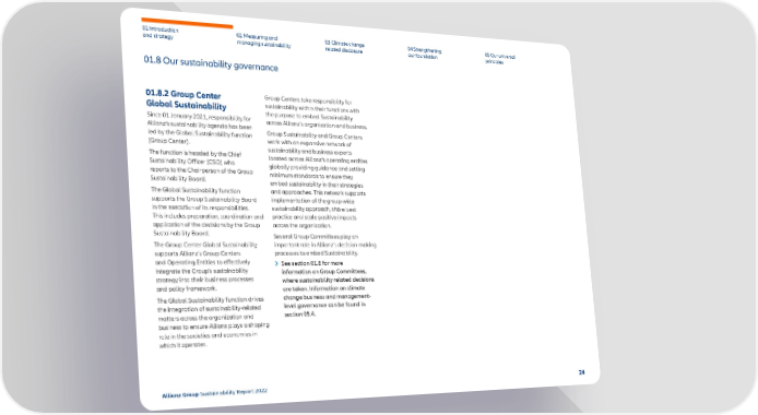 01 Introduction and strategy 02 Measuring and managing sustainability 03 Climate change related disclosure 04 Strengthening our foundation 05 Our universal principles 01.8.2 Group Center Global Sustainability Since 01 January 2021, responsibility for Allianz’s sustainability agenda has been led by the Global Sustainability function (Group Center). The function is headed by the Chief Sustainability Officer (CSO) who reports to the Chairperson of the Group Sustainability Board. The Global Sustainability function suppor ts the Group Sustainability Board in the execution of its responsibilities. This includes prep aration, coordination and application of the decisions by the Group Sustainability Board. The Group Center Global Sustainability supports Allianz’s Group Centers and Operating Entities to effectivel y integrate the Group’s sustainability strategy into their business processes and policy framework. The Global Sustainability function drives the integration of sustainability-related matters across the organization and business to ensure Allianz plays a shaping role in the so cieties and economies in which it operates. Group Centers take responsibility for sustainability within their functions with the purpose to embed Sustainability across Allianz’s organization and business. Group Sustainability and Group Centers w ork with an expansive network of sustainability and business experts located acr oss Allianz’s operating entities globally providing guidance and setting minimum standards to ensure they embed sustainability in their strategies and approaches. This network supports implementation of the group-wide sustainability approach, share best practice and scale positive impacts across the organization. Several Group Committees play an important role in Allianz’s decision-making processes to embed Sustainability. See section 01.8 for more information on Group Committees , where sustainability related decisions are taken. Information on climate change business and management- level governance can be found in section 05.4. 01.8 Our sustainability governance 24 Allianz Group Sustainability Report 2022