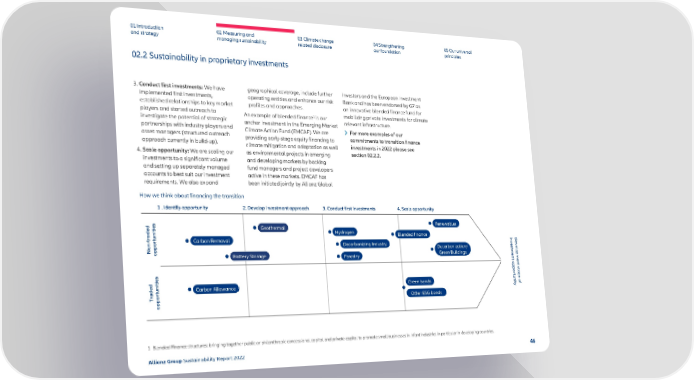 01 Introduction and strategy 02 Measuring and managing sustainability 03 Climate change related disclosur e 04 Strengthening our foundation 05 Our univ ersal principles 02.2 Sustainability in proprietary investments 3. Conduct first investments: We have implemented first inv estments, established relationships to key market players and started outreach to investigate the potential of strategic partnerships with industry players and asset managers (structured outreach approach currently in build-up). 4. Scale opportunity: We are scaling our inv estments to a significant volume and setting up separately managed accounts to best suit our investment requirements. We also expand geographical coverage, include further oper ating entities and enhance our risk profiles and approaches. An example of blended finance 1 is our anchor investment in the Emerging Market Climate Action Fund (EMCAF). We are providing early-stage equity financing to climate mitigation and adaptation as well as environmental projects in emerging and developing markets by backing fund managers and project developers active in these markets. EMCAF has been initiated jointly by Allianz Global Investors and the European Investment Bank and has been endorsed b y G7 as an innovative blended finance fund for mobilizing private investments for climate relevant infrastructure. For more examples of our commitments to transition finance investments in 2022 please see section 02.2.2. How we think about financing the transition 1 . Identify opportunity 2. Develop investment approach 3. Conduct first investments 4. Scale opportunity Non-traded opportunities Carbon Removal Battery Storage Geothermal Hydrogen Blended finance Decarbonizing Industry Forestry Renewables Decarbonization/ Green Buildings Traded opportunities Carbon Allowance Green bonds Other ESG bonds Development stage of investment opportunity 1 Blended Finance structures: bringing together public or philanthropic concessional capital and private capital to promote small businesses in infant industries in particular in developing countries. Allianz Group Sustainability Report 2022 46
