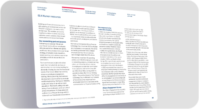 01 Introduction and strategy 02 Measuring and managing sustainability 03 Climate change r elated disclosure 04 Strengthening our f oundation 05 Our universal principles 02.4 Human resources Building confidence in tomorrow starts with creating an environment where our 154,023 1 employees can work and be at their best. This enables us to come together to deliver trusted, innovative, customer-centric solutions that impact communities and secure their future. Our overarching goal and purpose Delivering our purpose ‘We secure your future’ starts with our employees who are part of our diverse and global workforce. Our purpose anchors our Group strategy, employee value proposition, brand promise, and customer experience principles, and it drives our decisions and actions. To ensure that our people and culture r each their full potential, we focus on solutions that are not merely meeting the demands of today, but also the forecasted needs of the future. Allianz has a strong stance on employee engagement, training, lifelong learning, and personal development, accompanied by strategic workforce planning. We focus on diversity, equity and inclusion as well as talent acquisition. The health, safety, and well- being of our employees continue to be of utmost importance. All these areas are outlined in our People Strategy which is in line with our Stakeholder expectations. Updates are given to the Allianz SE Board of Management and Sup ervisory Board on a regular basis. Thereby, we fulfil our ambition as an employer to contribute to SDG 8, Decent work and Economic growth – i.e., to promote inclusive and sustainable economic growth, employment, and decent work for all. We held our third global Allianz Purpose & Str ategy Day in summer 2022 to engage our employees on our purpose. We turned a one-day global event into a deeper employee journey into our purpose, new strategic objectives, and culture. We reached more than 55 operating entities and 148,500 emplo yees took part in networking sessions, animated learning videos, an interactive virtual universe for employees to state their contribution to our purpose, and an interview with our CEO, Oliver Bäte, during which he provided a deep dive into our strategy 2022+. The positive impact of the Purpose & Strategy Day is reflected in an increase of favorable survey responses from employees towards our purpose and its communication to 71 percent (2021: 67 %). Our response to the multi-crisis situation In 2022, the ongoing COVID-19 pandemic, the war in Ukraine, a prevailing energy crisis, and rising inflation constituted a multi-crisis situation associated with increased uncertainty. Our goal at Allianz is to ensure our employees’ safety and health as a basis for sustainable economic success. Therefore, Allianz has implemented several initiatives in 2022. On a global level, we offered information and Q&A sessions to inform employees about the political and economic implications of the current situation. Within our Health & Well- being offers, special topics were included to strengthen the mental health of employees in this multi-crisis situation. In 2022, we extended the scope of our employee listening strategy by introducing two employee pulse surveys aimed at proactively identifying issues that might affect the engagement and well-being of our employees. In our annual employee survey, 84 percent of Allianz employees agree that the company is responding appropriately when faced with a crisis. Allianz Engagement Survey The Allianz Engagement Survey (AES) is our formal employee platform for gathering employee feedback on an annual basis and promoting a high p erformance culture. The results of the AES are directly linked to the performance targets of the Group’s Board of Management. In 2022, 133,944 employees (2021: 132,126) fr om 71 entities (2021: 64) worldwide were invited to take part in the AES. Participation in this Group wide survey remained high with a response rate of 84 percent (2021: 82 %). This year, two of the three main indices r eached record levels in Allianz Group history, the Inclusive Meritocracy Index (IMIX) – with 79 percent (2021: 78 %) – and the Work Well Index (WWi+) – with 71 percent (2021: 69 %). Our third index, the Employee Engagement Index (EEI) remained stable at the second highest level in Allianz history at 76 percent. We are proud of our organizational resilience in this time of crises that is reflected in these results. We consider these good results p articularly important as employee engagement is linked to increases in business profitability, talent retention, and performance. Across Allianz Group, we also find that operating entities with higher AES results are more likely to perform as NPS Loyalty Leaders among customers in their respective markets. 1 Figures include only employees in core business; total employees (core and non-core): 159,253. Allianz Group Sustainability Report 2022 64