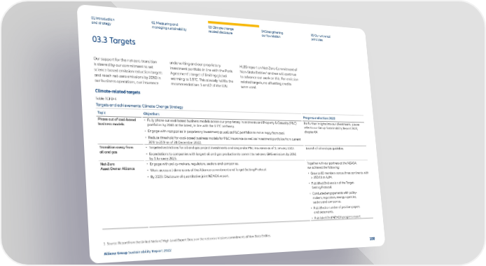 01 Introduction and strategy 02 Measuring and managing sustainability 03 Climate change related disclosure 04 Strengthening our foundation 05 Our universal principles 03.3 Targets Our support for the net-zero transition is steered by our commitment to set science-based emission reduction targets and reach net-zero emissions by 2050 in our business operations, our insurance underwriting and our proprietary investment portfolio in line with the Paris Agreement’s target of limiting global warming to 1.5°C. This already fulfills the recommendations 1 and 2 of the U.N. HLEG report on Net-Zero Commitment of Non-State Entities 1 and we will continue to advance our work on this. For emission- related targets, no offsetting credits were used. Climate-related targets Table TCFD-4 Targets and achievements: Climate Change Strategy Topic Objectives Progress and actions 2022 Phase out of coal-based business models • Fully phase out coal-based business models across our proprietary investments and Property & Casualty (P&C) portfolios by 2040 at the latest, in line with the 1.5°C pathway. • Engage with companies in proprietary investment as well as P&C portfolios to move away from coal. • Reduce threshold for coal-based business models for P&C insurance as well as investment portfolios from current 30% to 25% as of 31 December 2022. For further insights into our divestments, please refer to our Group Sustainability Report 2022, chapter 04. Transition away from oil and gas • Targeted restrictions for oil and gas project investments and single-site P&C insurance as of 1 January 2023. • Expectations to companies with largest oil and gas production to commit to net-zero GHG emissions by 2050 by 1 January 2025. Launch of oil and gas guideline. Net-Zero Asset Owner Alliance • Engage with policy-makers, regulators, sectors and companies. • Work across all dimensions of the Alliance commitment and Target-Setting Protocol • By 2023: Disclosure of quantitative joint NZAOA report. Together with our partners at the NZAOA, we achieved the following: • Grew to 82 members across three continents with > USD 11 tn AUM. • Published 2nd version of the Target- Setting Protocol. • Conducted engagements with policy- makers, regulators, energy agencies, sectors and companies. • Published a number of position papers and statements. • Published 2nd NZAOA progress report. Allianz Group Sustainability Report 2022 100 1 Source: Report from the United Nations’ High-Level Expert Group on the net zero emissions commitments of Non-State Entities.