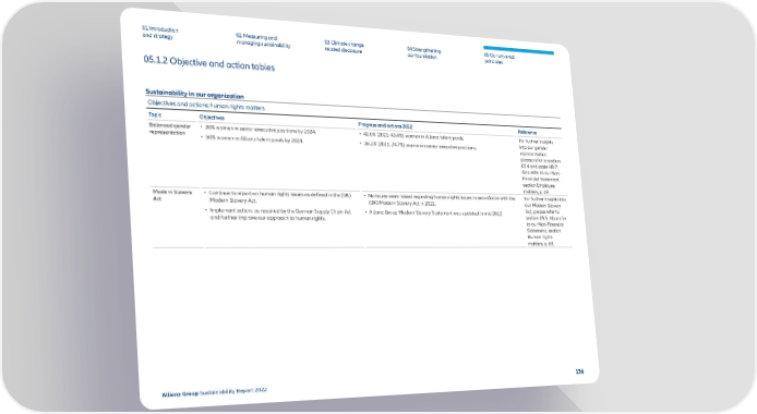 01 Introduction and strategy 02 Measuring and managing sustainability 03 Climate change related disclosure 04 Strengthening our f oundation 05 Our universal principles 05.1.2 Objective and action tables Sustainability in our organization Objectives and actions: human rights matters Topic Objectives Progress and actions 2022 Reference Balanced gender representation • 30% women in senior e xecutive positions by 2024. • 50% women in Allianz talent pools by 2024. • 42. 0 % (2021: 43.4%) women in Allianz talent pools. • 26.2% (2021: 24.7%) w omen in senior ex ecutive positions. For further insights into our gender representation, please ref er to section 02.4 and table HR-7. Also refer to our Non- Financial Statement, section Employee mat ters, p. 69. Modern Slavery Act • Continue to rep ort on human rights issues as defined in the (UK) Modern Slavery A ct. • Implement actions as required by the German Supply Chain Act and further improv e our approach to human rights. • No issues were raised regarding human rights issues in accordance with the (UK) Modern Slavery A ct in 2022. • Allianz Group Modern Slavery Statement was updated in mid-2022. For further insights into our Modern Slavery A ct, please refer to section 05.5. Also refer to our Non-Financial Statement, section Human rights matters, p. 68. Allianz Group Sustainability Report 2022 136