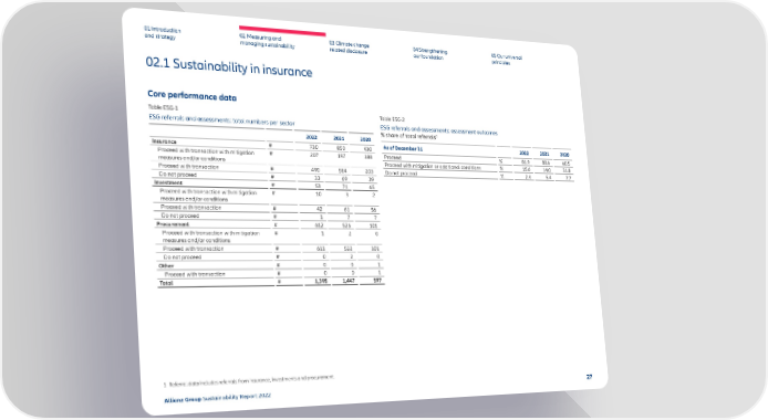 01 Introduction and strategy 02 Measuring and managing sustainability 03 Climate change related disclosure 04 Strengthening our foundation 05 Our universal principles 02.1 Sustainability in insurance Core performance data Table ESG-1 ESG referrals and assessments: total numbers per sector 2022 2021 2020 Insurance # 730 850 430 Proceed with transaction with mitigation measures and/or conditions # 207 197 188 Proceed with transaction # 490 584 203 Do not proceed # 33 69 39 Investment # 53 71 65 Proceed with transaction with mitigation measures and/or conditions # 10 3 2 Proceed with transaction # 42 61 56 Do not proceed # 1 7 7 Procurement # 612 526 101 Proceed with transaction with mitigation measures and/or conditions # 1 2 0 Proceed with transaction # 611 522 101 Do not proceed # 0 2 0 Other # 0 0 1 Proceed with transaction # 0 0 1 Total # 1,395 1,447 597 Table ESG-2 ESG referrals and assessments: assessment outcomes % share of total referrals 1 As of December 31 2022 2021 2020 Proceed % 81.9 80.6 60.5 Proceed with mitigation or additional conditions % 15.6 14.0 31.8 Do not proceed % 2.4 5.4 7.7 1 Referral data includes referrals from insurance, investments and procurement. Allianz Group Sustainability Report 2022 27