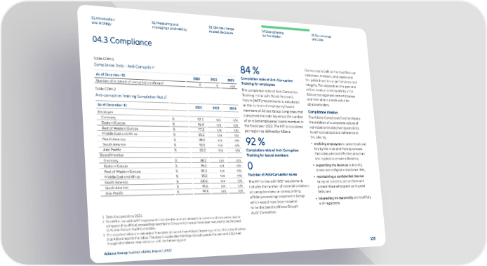 01 Introduction and strategy 02 Measuring and managing sustainability 03 Climate change related disclosure 04 Strengthening our foundation 05 Our universal principles 04.3 Compliance Table COM-1 Compliance Data – Anti-Corruption 1 As of December 31 2022 2021 2020 Number of incidents of corruption confirmed 2 0 0 n/a Table COM-2 Anti-corruption Training Completion Ratio 3 As of December 31 2022 2021 2020 Employee Germany % 92.1 n/a n/a Eastern Europe % 96.4 n/a n/a Rest of Western Europe % 77.3 n/a n/a Middle East and Africa % 85.2 n/a n/a North America % 98.9 n/a n/a South America % 91.5 n/a n/a Asia Pacific % 82.3 n/a n/a Board Member Germany % 88.2 n/a n/a Eastern Europe % 96.2 n/a n/a Rest of Western Europe % 83.1 n/a n/a Middle East and Africa % 90.0 n/a n/a North America % 100.0 n/a n/a South America % 95.6 n/a n/a Asia Pacific % 99.5 n/a n/a 84 % Completion ratio of Anti-Corruption Training for employees The completion ratio of Anti-Corruption Training in line with World Economic Forum (WEF) requirements is calculated as the number of employees/ board members of Allianz Group companies that completed the training versus the number of enrolled employees/ board members in the fiscal year 2022. The KPI is calculated per region as defined by Allianz. 92 % Completion ratio of Anti-Corruption Training for board members 0 Number of Anti-Corruption cases The KPI in line with WEF requirements includes the number of material violations of corruption laws or corresponding official proceedings reported to Group which would have been required to be disclosed to Allianz Group’s Audit Committee. Our success is built on the trust that our customers, investors, employees and the public have in our performance and integrity. This depends on the personal ethical conduct and capability of all Allianz management and employees and their aim to create value for all stakeholders. Compliance mission The Allianz Compliance function fosters the ambition of a corporate culture of individual and collective responsibility for ethical conduct and adherence to the rules by: • enabling employees to understand and live by the rules and thereby oversee that adequate and effective processes are in place to ensure adherence; • supporting the business to identify, assess and mitigate compliance risks; • maintaining a confidential channel to report concerns, act on them and protect those who speak up in good faith; and • interacting transparently and truthfully with regulators. 1 Data disclosed since 2021. 2 The KPI in line with WEF requirements includes the number of material violations of corruption laws or corresponding official proceedings reported to Group which would have been required to be disclosed to Allianz Group’s Audit Committee. 3 The reported ratios are calculated from data delivered from Allianz Operating entities. This is the first time that Allianz reports this ratios. The data includes also trainings roll-out close to the year end 2022 even though attendance may not occur until the following year. Allianz Group Sustainability Report 2022 125