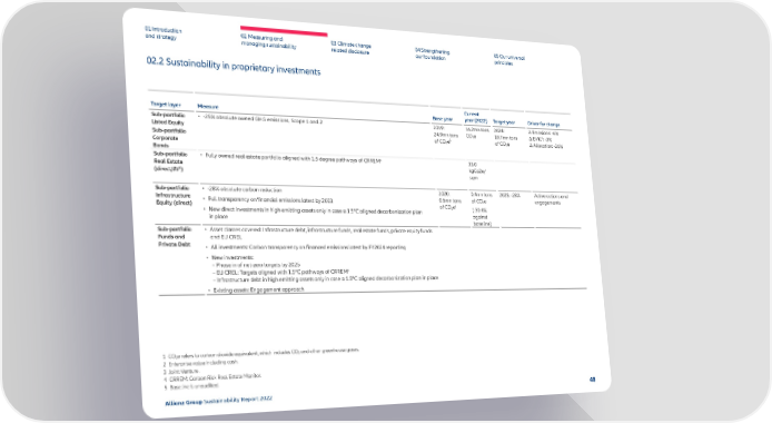01 Introduction and strategy 02 Measuring and managing sustainability 03 Climate change related disclosure 04 Strengthening our foundation 05 Our universal principles 02.2 Sustainability in proprietary investments Target layer Measure Base year Current year (2022) Target year Driver for change Sub-portfolio Listed Equity Sub -portfolio Corporate Bonds • -25% absolute owned GHG emissions, Scope 1 and 2 2019: 24.9mn tons of CO 2 e ¹ 16.2mn tons CO 2 e 2024: 18.7mn tons of CO 2 e ∆ Emissions: -6% ∆ EVIC 2 : -3% ∆ Allocation: -26% Sub-portfolio Real Estate ( direct/JV 3 ) • Fully owned real estate portfolio aligned with 1.5 degree pathways of CRREM 4 33.0 kgCo2e/ sqm Sub-portfolio Infrastructure Equity (direct) • -28% absolute carbon reduction • Full transparency on financial emissions latest by 2023 • New direct investments in high emitting assets only in case a 1.5ºC aligned decarbonization plan in place 2020: 0.6mn tons of CO 2 e 5 0.4mn tons of CO 2 e ( -30.4% against baseline) 2025: -28% Active actions and engagements Sub-portfolio Funds and Private Debt • Asset classes covered: Infrastructure debt, infrastructure funds, real estate funds, private equity funds and EU CREL • All investments: Carbon transparency on financed emissions latest by FY2024 reporting • New investments: – Phase in of net-zero targets by 2025 – EU CREL: Targets aligned with 1.5ºC pathways of CRREM 4 – Infrastructure debt in high emitting assets only in case a 1.5ºC aligned decarbonization plan in place • Existing assets: Engagement approach 1 CO 2 e refers to carbon dioxide equivalent, which includes CO 2 and other greenhouse gases. 2 Enterprise value including cash. 3 Joint Venture. 4 CRREM: Carbon Risk Real Estate Monitor. 5 Baseline is unaudited. Allianz Group Sustainability Report 2022 48