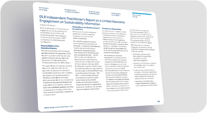 01 Introduction and strategy 02 Measuring and managing sustainability 03 Climate change related disclosure 04 Strengthening our foundation 05 Our universal principles 05.8 Independent Practitioner’s Report on a Limited Assurance Engagement on Sustainability Information To Allianz SE, Munich We have performed a limited assurance engagement on the disclosures in the sustainability report of Allianz SE, Munich (hereinafter “the Company”), for the period from January 1, 2022 to December 31, 2022 (hereinafter the “Report”). Responsibilities of the Executive Directors The executive directors of the Company are responsible for the preparation of the Report in accordance with the principles stated in the Sustainability Reporting Standards of the Global Reporting Initiative (hereinafter the “GRI-Criteria”). This responsibility of Company’s executive directors includes the selection and application of appropriate methods of sustainability reporting as well as making assumptions and estimates related to individual sustainability disclosures, which are reasonable in the circumstances. Furthermore, the executive directors are responsible for such internal controls as they have considered necessary to enable the preparation of a Report that is free from material misstatement whether due to fraud or error. Independence and Quality Control of the Audit firm We have complied with the German professional provisions regarding independence as well as other ethical requirements. Our audit firm applies the national legal requirements and professional standards – in particular the Professional Code for German Public Auditors and German Chartered Auditors ( “Berufssatzung für Wirtschaftsprüfer und vereidigte Buchprüfer“: “BS WP/ vBP” ) as well as the Standard on Quality Control 1 published by the Institut der Wirtschaftsprüfer (Institute of Public Auditors in Germany; IDW): Requirements to quality control for audit firms ( IDW Qualitätssicherungsstandard 1: Anforderungen an die Qualitätssicherung in der Wirtschaftsprüferpraxis – IDW QS 1) – and accordingly maintains a comprehensive system of quality control including documented policies and procedures regarding compliance with ethical requirements, professional standards and applicable legal and regulatory requirements. Practitioner’s Responsibility Our responsibility is to express a limited assurance conclusion on the disclosures in the Report based on the assurance engagement we have performed. Within the scope of our engagement we did not perform an audit on external sources of information or expert opinions, referred to in the Report. Furthermore, we did not perform any procedures on any forward-looking statements such as projections and forecasts. We conducted our assurance engagement in accordance with the International Standard on Assurance Engagements (ISAE) 3000 (Revised): Assurance Engagements other than Audits or Reviews of Historical Financial Information, issued by the IAASB. This Standard requires that we plan and perform the assurance engagement to allow us to conclude with limited assurance that nothing has come to our attention that causes us to believe that the disclosures in the Company’s Report for the period from January 1, 2022 to December 31, 2022 have not been prepared, in all material aspects, in accordance with the GRI-Criteria. In a limited assurance engagement the assurance procedures are less in extent than for a reasonable assurance engagement and therefore a substantially lower level of assurance is obtained. The assurance procedures selected depend on the practitioner’s judgment. Within the scope of our assurance engagement, we performed amongst others the following assurance procedures and further activities: • Obtaining an understanding of the structure of the sustainability organization and of the stakeholder engagement • Assessment of the process for conducting the materiality analysis in accordance with the GRI criteria • Inquiries of personnel involved in the preparation of the Report regarding the preparation process, the internal control system relating to this process and selected disclosures in the Report • Identification of the likely risks of material misstatement of the Report under consideration of the GRI-Criteria 160 Allianz Group Sustainability Report 2022