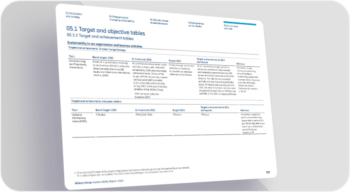 01 Introduction and strategy 02 Measuring and managing sustainability 03 Climate change r elated disclosure 04 Strengthening our f oundation 05 Our universal principles 05.1 Target and objective tables 05.1.1 Target and achievement tables Sustainability in our organization and business activities Targets and achievements: Climate Change Strategy Topic Board targets 2022 Achievements 2022 Targets 2023 Targets and commitments 2024 and b eyond Reference Decarbonizing our Pr oprietary Investments Establish a quantitative roadmap to r each minus 25% GHG emissions (absolute reduction on public equity and listed corporate debt by 2024 vs 2019) All portfolio decarbonization levers ar e fully on track, with -25% GHG emissions by 2024 year-end target achieved already. On top of the target, AIM SE has actively shaped various sustainability-related topics, internally and externally, during 2022, leading and shaping ambition of the Allianz Group. -35% 1 emission reduction (baseline 2019). Follow through on net-zero ambition, in p articular in line with our Net Zero Alliances commitments. As an intermediary target, we aim to r educe our emissions in listed equities and tradeable corporate bonds by 25% by year-end 2024, compared to the 2019 baseline. The fully owned real estate portfolio will be in line with scientifically based 1.5-degree pathways by year-end 2024. We also set emission reduction and engagement targets for our infrastructure portfolio in line with 1.5-degree pathways. For further insights into our dec arbonizing of our Proprietary Investments, please refer to section 02.2.2. Also refer to our Non-Financial Statement , section Environmental matters, p. 60–64. Targets and achievements: employee matters Topic Board targets 2022 Achievements 2022 Targets 2023 Targets and commitments 2024 and b eyond Reference Inclusive Merito cracy Index (IMIX) 75% plus 79% (2021: 78%) 75% plus 75% plus For further insights into our inclusiv e meritocracy, please refer to section 02.4 and HR-12. Also refer to our Non-Financial Statement , section Employee matters, p. 73. 1 The original 2019 baseline figure got limited assurance. Due to a methodology change, the baseline figure was restated. The r estated figure was not audited. The 2022 carbon footprint figure has reasonable assurance level. Allianz Group Sustainability Report 2022 131