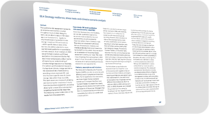 03.4 Strategy resilience, stress tests and climate scenario analysis 01 Introduction and strategy 02 Measuring and managing sustainability 03 Climate change related disclosure 04 Strengthening our foundation 05 Our universal principles Outlook The qualitative risk assessment represents an extensive exercise that occurred throughout much of 2022. Using this basis, we are able to apply a risk-based approach to determine – against a very broad scope of potential climate change impacts on Allianz’s business – which specific risks or areas of the business should be subjected to more sophisticated qualitative or quantitative scenario analysis. As an example, in 2022 we performed a bottom-up OE level qualitative risk assessment for the P&C retail motor and property LOBs. In terms of improving our understanding of climate change impacts on our business, this bottom-up OE assessment supports the top-down climate change qualitative risk assessment described above by providing a more nuanced, OE- and retail-business specific view of climate change risks within those two LOBs. This both serves as a means of validating and increasing the robustness of results from the top-down assessment, as well as allowing for a more OE or sub-segment targeting of potential risk responses. The following content elaborates on the results from this assessment. Case study: OE level qualitative risk assessment for retail P&C Given their business focus and flexibility, we consider qualitative approaches as suitable tools to identify risks and opportunities, as well as potential response options, from a strategic angle. They allow us to explore in principle a rich set of transmission channels and interdependencies that do not have to be hardwired from the outset. Here, we report on an extension of the survey-based assessment covering our major P&C retail lines of business that we launched in 2021 as part of our Group-wide climate change initiative which aims to identify and assess related risks and opportunities. Methods, assumptions and limitations The Network for Greening the Financial System (NGFS) provides six scenarios with differing levels of physical and transition risks. For the qualitative risk assessment, we have chosen the two ‘extreme’ scenarios of ‘Divergent Net-Zero’ and ‘Current Policies’ to present two clearly distinguishable development paths to the participants of the survey. ‘Divergent Net- Zero’ is characterized by ambitious and immediate, but rather un-coordinated climate policies. Under this scenario the net-zero target will be reached in 2050, with relatively low physical risks in comparison to scenarios with more severe global warming. However, these low physical risks will be accompanied by a lack of policy coordination across sectors, resulting in rather high transition costs that are further compounded by fast technological changes. The scenario ‘Current Policies’, on the other hand, assumes that only currently implemented policies are preserved, implying relatively slow technological change resulting in low transition risks, but high long-term physical risks due to global warming exceeding 3°C by the end of the century. For this bottom-up qualitative risk assessment we have kept the scope of the exercise with regards to lines of business and time horizons unchanged, meaning participants were asked to give their assessments for the retail motor and property lines of business over two different time horizons (i.e. short- to mid-term 2022 to 2030 and long-term 2031 to 2050). However, we increased the granularity of the survey by focusing on our four largest European markets; France, Germany, Italy and UK. In order to provide participants a better understanding of how the scenarios might affect the business environment we further augmented NGFS data with specific business drivers, such as the numbers of electric vehicles or targets for retrofitting buildings tailored to local markets. Finally, the risks and opportunities from climate change were assessed on a four- point scale based on qualitative criteria, including shrinking markets, higher claims, dwindling reinsurance capacity or changes that increase the market’s susceptibility to disruption, while also considering efforts that need to be undertaken to adapt to a changing business environment. Ratings were established for volume and profitability impacts as well as overall consequences. The subsequent assessment of risk mitigation necessity considered whether effective mitigation is provided by business-as-usual risk management practices, such as re-pricing or reinsurance, or whether extraordinary measures such as a business-line exit need to be taken, and whether a strategy on how the business might respond to the risk has already been elaborated. Ratings are commented for proper contextualization of the survey participants’ choices. Allianz Group Sustainability Report 2022 107