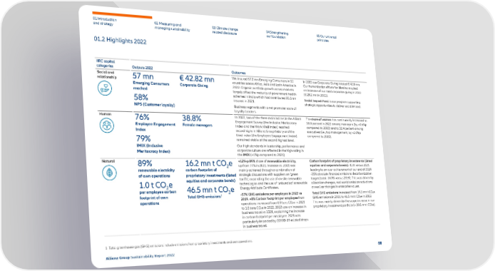 01.2 Highlights 2022 01 Introduction and strategy 02 Measuring and managing sustainability 03 Climate change related disclosure 04 Strengthening our foundation 05 Our universal principles IIRC capital categories Outputs 2022 Outcomes Social and r elationship 57 mn Emerging Consumers reached 58% NPS (Customer loyalty) € 42.82 mn Corporate Giving We insured 57.2 mn Emerging Consumers in 12 countries across Africa, Asia and Latin America in 2022. Organic portfolio growth across markets largely offset the maturity of government health schemes in India which had contributed 15.5 mn insured in 2021. Business segments with a net promoter score of L oyalty Leaders. In 2022 our Corporate Giving totaled € 42.8 mn. Our humanitarian eff orts for Ukraine resulted an increase of our total corporate giving in 2022 (€ 28.2 mn in 2021). Social Impact Fund is our program supporting str ategic opportunities to deliver social impact. Human 76% Employee Engagement Index 79% IMIX (Inclusive Meritocracy Index) 38.8% Female managers In 2022, two of the three main indices in the Allianz Engagement Survey (the Inclusive Meritocracy Index and the Work Well Index) reached record highs in Allianz Group history and the third index (the Employee Engagement Index) remained stable at the second highest level. Our high standards in leadership, performance and c orporate culture are reflected in the high rating in the IMIX (+1%p compared to 2021). The share of women has continuously increased to 38.8 p ercent in 2022 among managers (by +0.6%p compared to 2020) and to 32.4 percent among executives (i.e., top management, by +2.0%p compared to 2020). Natural 89% renewable electricity of own operations 1.0 t CO 2 e per employee carbon footprint of own operations 16.2 mn t CO 2 e carbon footprint of proprietary investments (listed equities and corporate bonds) 46.5 mn t CO 2 e Total GHG emissions 1 +12%-p 89% share of renewable electricity, up from 77% in 2021. Increase vs. 2021 was mainly achieved through a combination of strategic discussions with suppliers on ‘green tariffs’, expanding the use of on-site renewable technologies and the use of ‘unbundled’ renewable Energy Attribute Certificates. -57% GHG emissions per employee in 2022 vs 2019. +8% C arbon footprint per employee from operations increased from 0.9 tons CO 2 e in 2021 to 1.0 tons CO 2 e in 2022. 2022 saw an increase in business tr avel vs 2021, explaining the increase in carbon footprint per employee. 2021 was particularly impacted by COVID-19-related drops in business travel. Carbon footprint of proprietary investments (listed equities and c orporate bonds): -13% versus 2021 leading to an o ver achievement of our end of 2024 -25% absolute financed emissions decarbonization tar get (total -34.9% versus 2019). This was driven by allo cation changes, real world emission reductions as well as changes in enterprise values. Total GHG emissions increased from 19.3 mn t CO 2 e GHG emissions in 2021 to 46.5 mn t CO 2 e in 2022. This w as mainly driven by the scope increase in our proprietary investment portfolio (+ 30.1 mn t CO 2 e). 08 Allianz Group Sustainability Report 2022 (fr\ © 1 Total greenhouse gas (GHG) emissions include emissions from proprietary investments and own operations.