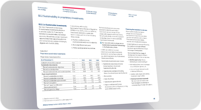 01 Introduction and strategy 02 Measuring and managing sustainability 03 Climate change related disclosure 04 Strengthening our foundation 05 Our universal principles 02.2 Sustainability in proprietary investments 02.2.1.6 Sustainable investments Our clear framework and strategy for sustainable investments allows us to provide capital for financing the transition to a sustainable, low-carbon economy. We actively pursue investment opportunities that support solutions to environmental and societal challenges, aligned with the U.N. SDGs. Table ESG-7 Proprietary sustainable investments Proprietary Investments € bn As of December 31 2022 2021 2020 Global Portfolio ESG screened 1 € bn 701.1 849.2 835.0 Sustainable investments € bn 131.5 123.1 127.0 2 Thereof environmental objectives € bn 111.2 109.9 115.6 Thereof social objectives € bn 8.4 12.0 10.8 Thereof environmental and social objectives € bn 11.8 1.1 0.5 Asset class breakdown Thereof sustainable sovereigns € bn 87.9 84.1 92.7 Thereof sustainable corporates € bn 20.2 25.5 21.9 Thereof sustainable supranationals € bn 10.1 0.0 0.0 Thereof renewables € bn 7.0 7.0 6.9 Thereof impact and Blended Finance Investments € bn 0.8 0.4 0.2 Thereof green buildings € bn 5.6 6.4 5.6 In accordance with the E.U. Sustainable Finance Disclosure Regulation (SFDR) Article 2(17), under our definition, investments labelled as sustainable have to comply with all of the following three criteria: 1. Positive contribution to an environmental and/or social objective; 2. Do no significant harm; and 3. Follow good governance practices. We have developed an assessment approach to identify sustainable investments across a range of asset classes with respect to the three criteria. We will periodically review this approach to develop a best-in-class sustainable investments framework. For more information, please see our Sustainable Investments Methodology in the Explanatory Notes. In 2022, we added a new asset class to our sustainable in vestments assessment, namely Supranationals e.g., debt investments into Multinational Development Banks. Sustainable investments asset classes: • Sustainable corporates and other (including Green, Social and Sustainability Bonds) • Sustainable sovereigns (including Green, Social and Sustainability Bonds) • Renewables • Green buildings • Sustainable supranationals • Impact and blended finance investments (Article 9 Funds according to EU SFDR Article 2 (17)). 1 Based on economic view. 2 Numbers were not part of the audit engagement. Financing the transition to net-zero Allianz systematically investigates a large spectrum of potential investments to finance the low-carbon transition and achieve positive impact. This covers various asset classes, markets, technologies and strategies. A meaningful way to approach financing the tr ansition is to cluster different investment opportunities according to their stage of development. We have identified four stages of dev elopment that result in different activities and actions from our business: 1. Identify opportunity : We are de veloping an understanding of • technical solutions, main challenges, cost profile/development, etc. • risks and impact (interaction with initiatives, NGOs, etc.) • market, main players and existing investment opportunities 2. Develop investment approach: W e reach out and interact with fund managers and develop an understanding of ‘lowest risk’ options. Allianz Group Sustainability Report 2022 45