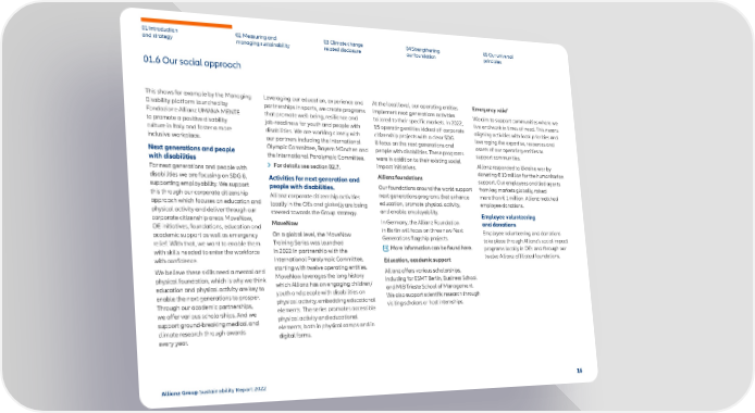 01.6 Our social approach 01 Introduction and strategy 02 Measuring and managing sustainability 03 Climate change related disclosure 04 Strengthening our foundation 05 Our universal principles This shows for example by the Managing Disability platform launched by Fondazione Allianz UMANA MENTE to promote a positive disability culture in Italy and foster a more inclusive workplace. Next generations and people with disabilities For next generations and people with disabilities we are focusing on SDG 8, supporting employability. We support this through our corporate citizenship approach which focuses on education and physical activity and deliver through our corporate citizenship areas MoveNow, OE initiatives, foundations, education and academic support as well as emergency relief. With that, we want to enable them with skills needed to enter the workforce with confidence. We believe these skills need a mental and physical foundation, which is why we think education and physical activity are key to enable the next generations to prosper. Through our academic partnerships, we offer various scholarships. And we support ground-breaking medical and climate research through awards every year. Leveraging our education, experience and partnerships in sports, we create programs that promote well-being, resilience and job-readiness for youth and people with disabilities. We are working closely with our partners including the International Olympic Committee, Bayern München and the International Paralympic Committee. For details see section 02.7. Activities for next generation and people with disabilities. Allianz corporate citizenship activities locally in the OEs and globally are being steered towards the Group strategy. MoveNow On a global level, the MoveNow Tr aining Series was launched in 2022 in partnership with the International Paralympic Committee, starting with twelve operating entities. MoveNow leverages the long history which Allianz has on engaging children/ youth and people with disabilities on physical activity, embedding educational elements. The series promotes accessible physical activity and educational elements, both in physical camps and in digital forms. At the local level, our operating entities implement next gener ations activities tailored to their specific markets. In 2022, 15 operating entities kicked off corporate citizenship projects with a clear SDG 8 focus on the next generations and people with disabilities. These programs were in addition to their existing social impact initiatives. Allianz foundations Our foundations around the world support next gener ations programs that enhance education, promote physical activity, and enable employability. In Germany, the Allianz Foundation in Berlin will fo cus on three new Next Generations flagship projects. More information can be found here. Education, academic support Allianz offers various scholarships, including for ESMT Berlin, Business Scho ol and MIB Trieste School of Management. We also support scientific research through visiting scholars or host internships. Emergency relief We aim to support communities where we live and w ork in times of need. This means aligning activities with local priorities and leveraging the expertise, resources and assets of our operating entities to support communities. Allianz responded to Ukraine war by donating € 10 million for the humanitarian supp ort. Our employees and tied agents from key markets globally, raised more than € 1 million. Allianz matched employee donations. Employee volunteering and donations Employee volunteering and donations take place through Allianz’s social impact programs locally in OEs and through our twelve Allianz-affiliated foundations. 16 Allianz Group Sustainability Report 2022 >