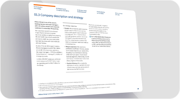 01 Introduction and strategy 02 Measuring and managing sustainability 03 Climate change related disclosure 04 Strengthening our foundation 05 Our universal principles 01.3 Company description and strategy Allianz Group is one of the world’s leading insurers and asset managers with 122 million private and corporate customers 1 in more than 70 countries. Our customers benefit from a broad range of personal and corporate insurance services ranging from property, life and health insurance to assistance services to credit insurance and global business insurance with total revenues of € 152.7 billion. As one of the world’s largest investors, Allianz manages around € 701.1 billion on behalf of its insurance customers. Our asset managers – PIMCO and Allianz Global Investors – manage € 1.6 trillion of third-party assets. In 2022, 159,253 2 employees achieved total revenues of € 152.7 billion 3 and an operating profit of 14.2 4 billion for the Group. Our strategic objectives : • Growth: We consistently seek to capture growth opportunities for our business, and to create growth opportunities for our employees. This is how we ensure our leading market position. Due to our full breadth of products and services, we offer comprehensive solutions that meet our customers’ needs and make us a trusted partner. • Margin expansion: We need to be profitable and efficient. To do so, we are continuously improving our productivity, including in our distribution channels, while seeking to grow in high margin business segments. Additionally, we will continue our transformation to be more simple, digital and scalable. • Capital efficiency: We consistently seek ways to use our capital in the most effective way and take actions when it falls below our RoE threshold. Thanks to our systematic integration of sustainability criteria in our business processes and investment decisions, we are among the leaders in the insurance industry in the Dow Jones Sustainability Index. For further details about the group’s Corporate Strategy, please see the Allianz Group Annual Report 2022 , section Risk and Opp ortunity Report p. 102 f. and the materials published as p art of our Inside Allianz Series. 1 Including non-consolidated entities with Allianz customers and excl. emerging consumers. 2 Total employees (core and non-core business). 3 Total revenues comprise Property-Casualty total revenues (gross premiums written, and fee and commission income), Life/Health statutory gross premiums written, operating revenues in Asset Management, and total revenues in Corporate and Other (Banking). 4 For details about Allianz Operating Profit definition, please refer to the Group Annual Report – Notes to the consolidated financial statements, note 4. 09 Allianz Group Sustainability Report 2022 (!)