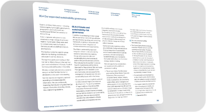 05.4 Our expanded sustainability governance 01 Introduction and strategy 02 Measuring and managing sustainability 03 Climate change related disclosure 04 Strengthening our foundation 05 Our universal principles Experts at Allianz Reinsurance – including meteorologists, hydrologists, geophysicists, geographers and mathematicians – model around 50 Nat Cat scenarios for Allianz Group. Data is captured using best-in-class standards to map a range of perils and regions. In past years, these were used to conduct stress-tests for floods in Germany as well as wildfires in the U.S. and Australia. The results provide the basis for group- wide risk monitoring, risk limits and subsequent business decisions. The top three perils contributing to Nat Cat risk for Allianz Group in the past four years were windstorms in Europe, floods in Germany and earthquakes in Australia. We also conduct selected stress-scenario analysis on Nat Cat risks like hail or windstorms to be used in risk steering. Nat Cat models are regularly updated according to the latest scientific information. We are continuously improving the inclusion of global Nat Cat hazard information, including climate, into underwriting decisions. 05.4.5 Climate and sustainability-risk governance In addition to addressing climate-related risks as part of our overarching qualitative and quantitative reporting and controlling framework, a variety of corporate rules and processes foster integration of climate-related risks and opportunities. The Allianz sustainability approach integrates climate- and sustainability- related considerations by applying Group-wide corporate rules and sustainability instruments across all underwriting and investment activities. This includes the Allianz ESG Functional Rule for Investments and the Allianz Standard for Reputational Risk and Issues Management which establish a core set of principles and processes for the management of reputational risks and sustainability issues within the Group. All corporate rules are regularly updated to reflect newest insights and external developments. The publicly-available 4 th report edition of the Allianz ESG Integration Framework increases transparency around internal processes and guidelines related to our sustainability approach. We also rely on external providers for data related to climate, sustainability and reputational risks. As an additional layer, the Climate Integration team within Global Sustainability and the sustainability Task Forces ensure the early identification, measurement and business integration of risks and opportunities arising from physical climate change and the low- carbon transition. Examples include regulatory activity around climate change and sustainable finance, integration of sustainability and climate considerations in business processes, and dedicated projects. Substantial topics are channeled to the Sustainability Board to inform their strategic decision-making. Risk and opportunity considerations are supplemented by additional processes including: • The annual Allianz Risk Barometer produced by Allianz Global Corporate & Specialty. This is a survey of corporate clients, brokers, industry trade organizations, risk consultants, underwriters, senior managers and claims experts, in total collecting more than 2,650 responses from 89 countries and 22 industry sectors. Climate change is ranked sixth. It is also linked to Nat Cat risks in third position, as a key risk to property business, and gains increasing importance in shaping emission- intensive industries in terms of transition risks. Business interruption is ranked second highest, behind cyber incidents, with potential triggers found in climate- related events. You can access the full Risk Barometer here. • The Global Claims Review analyzes more than 470,000 claims in over 200 countries and territories. The latest Review from 2019 found windstorms as the only Nat Cat event to appear in the top 10 causes of loss. Natural catastrophes account for five percent of claims in number and 13 percent of total value of all claims. It represents some of the largest exposures to energy as well as property and engineering segments. Environmental and climate change-related liability issues are seen to potentially increase in future. • Our partnership and memberships as described in section 05.3 facilitate early risk detection as well as access to industry discussions and best practice. • Our regular materiality assessment ranks emerging sustainability and climate issues and opportunities according to their importance for our business and our stakeholders. See section 05.3. > 151 Allianz Group Sustainability Report 2022