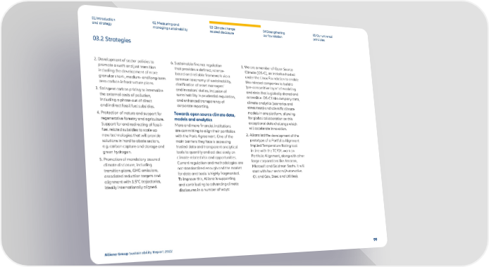 03.2 Strategies 2. Development of sector policies to promote a swift and just transition including the development of more granular short-, medium- and long-term zero carbon infrastructure plans. 3. Stringent carbon pricing to internalize the external costs of pollution, including a phase-out of direct and indirect fossil fuel subsidies. 4. Protection of nature and support for regenerative forestry and agriculture. Support for and redirecting of fossil- fuel related subsidies to scale up new technologies that will provide solutions in hard to abate sectors, e.g. carbon capture and storage and green hydrogen. 5. Promotion of mandatory assured climate disclosure, including transition plans, GHG emissions, associated reduction targets and alignment with 1.5°C trajectories, ideally internationally aligned. 6. Sustainable finance regulation that provides a defined, science- based and reliable framework via a common taxonomy of sustainability, clarification of asset managers’ and investors’ duties, inclusion of sustainability in prudential regulation, and enhanced transparency of corporate reporting. 01 Introduction and strategy 02 Measuring and managing sustainability 03 Climate change related disclosure 04 Strengthening our foundation 05 Our universal principles Towards open source climate data, models and analytics More and more financial institutions are committing to align their portfolios with the Paris Agreement. One of the main barriers they face is accessing trusted data and transparent analytical tools to quantify and act decisively on climate-related risk and opportunities. Current regulation and methodologies are not standardized enough and the market for data and tools is highly fragmented. To improve this, Allianz is supporting and contributing to advancing climate disclosures in a number of ways: 1. We are a member of Open Source Climate (OS-C), an initiative hosted under the Linux Foundation to enable like-minded companies to build a ‘pre-competitive layer’ of modeling and data that is globally shared and accessible. OS-C links company data, climate analytics (scenarios and stress tests) and scientific climate models in one platform, allowing for global collaboration on this exceptional data challenge which will accelerate innovation. 2. Allianz led the development of the prototype of a Portfolio Alignment Implied Temperature Rating tool in line with the TCFD’s work on Portfolio Alignment, along with other large corporations like Amazon, Microsoft and Goldman Sachs. It will start with four sectors (Automotive, Oil and Gas, Steel and Utilities). Allianz Group Sustainability Report 2022 99
