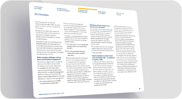 Solutions approach, we provide standardized and tailor-made insurance products and are insuring renewables in 70 countries. 01 Introduction and strategy 02 Measuring and managing sustainability 03 Climate change r elated disclosure 04 Strengthening our f oundation 05 Our universal principles 03.2 Strategies We also aim to reduce the impacts of climate risks and incentivize preventive measures to increase customers’ resilience and compensate for climate- related damages. Examples include risk consulting services off ered by AGCS, our active support of the InsuResilience Global Partnership and our work with the German Corporation for International Cooperation (GIZ) to pilot innovative insurance solutions in emerging and developing countries. Active company dialogue, joining forces and targeted engagement We actively engage investee companies and insurance clients using a variety of channels and formats. A key forum for engaging the 166 most carbon- intensive companies is Climate Action 100+ (CA100+), a collective engagement platform made up of more than 700 global investors responsible for more than $68 trillion in assets under management. Our goals and actions in CA100+ are explained in section 02.2. AIM has a dedicated engagement function f or pr oprietary investments and systematically engages with external asset managers on climate integration, climate risk management, proxy voting processes and public discourse. In addition, our internal asset managers, A llianzGI and PIMC O, and our insurance entities are active stewards on climate- related matters. For more details on our engagement approach please see sections 02.2 and 02.3. For voting records of AllianzGI, please refer to their overview web page. We are joining forces with other asset o wners in encouraging companies to implement transition pathways. Our participation in the Transition Pathway Initiative (TPI), CA100+ and the Principles for Responsible Investment (PRI) connects us with like-minded investors and offers opportunities for collaborative engagement. On decarbonization matters, the AOA strives to be the link between these existing engagement platforms, asset owners, target verification initiatives and tools and policymakers. Addressing climate change in our own business operations We rate impacts from climate change risks on the operations of the Allianz Group to be of limited materiality. The exposure of Allianz offices and data centers to locations at high risk of extreme weather events is contained and managed through risk mitigation measures as well as business continuity and disaster recovery plans. The low carbon footprint of our operations mak es us less prone to carbon price risk and we have committed to reduce it further. See section 02.6. Forest protection to protect carbon sinks and biodiversity – our approach to carbon credits In 2019, we committed to pursue efforts to limit global warming to a maximum of 1.5°C by the end of the century and aim for net-zero emissions by 2050. We have claimed our operations to be ‘carbon neutral’ since 2012. This has been achieved through investments in the protection of existing rainforests, maintaining significant carbon sinks and biodiversity while empowering the local population through job creation, provision of health care and education and preserving biodiversity. Looking ahead, we believe the focus should b e b oth on reducing emissions in line with science and protecting natural systems. We have set corresponding targets to reduce emissions in our investments and operations, see respective sections in chapter 02. Targets for insur ance underwriting are expected to follow in 2023. Science has made clear that the 1.5°C target will require an upscaled removal of emissions from the atmosphere into technical and natural carbon sinks in the mid-term. The IPCC defines carbon neutrality as achieved when anthropogenic emissions of GHGs to the atmosphere are balanced by anthropogenic removals over a specified period. We support this understanding in the context of our net-zero commitment. Given our focus on our emission reductions and that we wanted to await the results of the United Nations HLEG Group’s report on Net-Zero Commitments of Non- State Actors, we delayed our strategy development on carbon removal and associated net-zero offsetting to 2023. Allianz Group Sustainability Report 2022 97