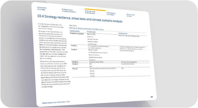 01 Introduction and strategy 02 Measuring and managing sustainability 03 Climate change related disclosure 04 Strengthening our foundation 05 Our universal principles 03.4 Strategy resilience, stress tests and climate scenario analysis Climate change considerations are an integral part of our insurance and investment strategy. We apply various quantitative and qualitative approaches to carry out climate stress testing and scenario analysis in consideration of the longtime horizons over which climate change may unfold and the high uncertainty over the direction of future climate and economic developments. Our objective is to foster risk awareness, build expertise in the assessment of financial risks from climate change, test our business strategy and inform risk management and business decision making. We perform sensitivity and scenario analyses with time horizons up to 2050 and including scenarios ranging from 1.5°C to 4°C of average warming by the end of the century. We make use of internal models and external tools. While time horizons naturally differ depending on the lines of business under consideration, the range of scenarios we apply allows us to better assess the variety of risks and opportunities associated with climate change. Table TCFD-5 Overview of climate scenarios applied by Allianz Group Aspects covered Scenarios used Scenario provider Transition and physical Net-Zero 2050 Below 2°C Divergent Net-Zero Delayed Transition Current Policies Network for Greening the Financial System Transition 97 C1 scenarios in Assessment Report 6 (no and low overshoot) Intergovernmental Panel on Climate Change (IPCC) (building on a multitude of scenario providers) Transition Net-zero by 2050 Sustainable Development Scenario Beyond 2 ̊ Scenario Stated Policies Scenario 2° Scenario International Energy Agency Transition One Earth Climate Model University of Technology Sydney Transition RPS FPS Inevitable Policy Response Physical Representative Concentration Pathway (RCP) 2.6 RCP 4.5 RCP 6.0 RCP 8.5 IPCC Allianz Group Sustainability Report 2022 102