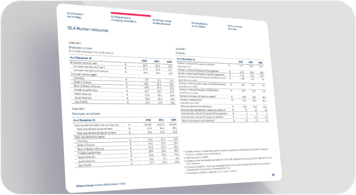 01 Introduction and strategy 02 Measuring and managing sustainability 03 Climate change related disclosure 04 Strengthening our foundation 05 Our universal principles 02.4 Human resources Table HR-5 Employee turnover % of total employees (core business) As of December 31 2022 2021 2020 Employee turnover rate % 16.9 15.3 12.9 Turnover rate (share of men) % 17.3 15.8 12.7 Turnover rate (share of women) % 16.3 14.9 12.9 Turnover rate by region Germany % 9.7 8.1 6.4 Eastern Europe % 20.0 15.6 15.6 Rest of Western Europe % 19.5 17.6 14.5 Middle East & Africa % 23.7 23.7 21.9 North America % 17.3 16.1 13.4 South America % 16.3 16.8 13.9 Asia Pacific % 22.3 21.9 18.5 Table HR-6 Employee recruitment As of December 31 2022 2021 2020 Total recruitment (external and internal) # 29,210 33,378 19,564 Total recruitment (share of men) % 47.4 46.2 49.6 Total recruitment (share of women) % 52.6 53.8 50.4 Total recruitment by region Germany % 12.0 32.3 10.9 Eastern Europe % 14.2 11.0 10.4 Rest of Western Europe % 21.3 17.5 12.4 Middle East & Africa % 29.9 23.6 18.1 North America % 21.6 15.6 11.1 South America % 13.2 8.1 6.0 Asia Pacific % 27.9 24.0 23.0 Table HR-7 Diversity As of December 31 2022 2021 2020 Women in Allianz SE Supervisory Board Legal obligation 30% % 41.7 33.3 33.3 Women in Allianz SE Board of Management % 27.3 20.0 20.0 Women in Executive Positions (Top Management) 1 % 32.4 31.6 30.4 Women in Allianz Global Executive (AGE) Positions 2 Target 30% by year-end 2024 % 23.8 24.5 n/a Women in Allianz Senior Executive (ASE) Positions 2 Target 30% by year-end 2024 % 26.2 24.7 n/a Women in Allianz Executive (AE) Positions 2 Target 40% by year-end 2024 % 33.7 32.8 n/a Female managers (of total managers) 3 % 38.8 38.6 38.2 Women in talent pools Target 50% by year-end 2024 % 42.0 43.4 42.3 Share of women in core business % 52.0 51.6 51.3 Nationalities represented in executive positions 4 # 73 67 59 Nationalities in Allianz SE Board of Management # 6 5 6 Nationalities in Allianz SE Supervisory Board # 5 n/a n/a Share of employees with disability 5 % 2.3 2.3 2.0 1 Includes women in all executive positions (Allianz Global Executive Positions, Allianz Senior Executive Positions, and Allianz Executive Positions). 2 Data disclosed since 2021. 3 Includes women functionally responsible for other staff, regardless of level, e.g., division, department and team managers. 4 Figures calculated by including all executive positions (Allianz Global Executive Positions, Allianz Senior Executive Positions and Allianz Executive Positions). 5 Excluding United States employees due to legal constraints. Allianz Group Sustainability Report 2022 59