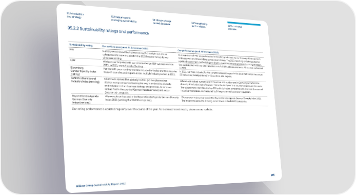 01 Introduction and strategy 02 Measuring and managing sustainability 03 Climate change related disclosure 04 Strengthening our foundation 05 Our universal principles Sustainability rating Our performance (as of 31 December 2021) Our performance (as of 31 December 2022) PRI In 2020, we achieved the highest rating (A+) in eight out of nine categories and w ere included in the 2020 Leaders’ Group for our climate repor ting. As a signatory of PRI, we particip ated in the 2021 pilot detailing our thorough ESG approach to Investment and Stewardship across asset classes. The 2021 reporting cycle introduced an updated assessment metho dology so that no overall scores are provided for an organization. CDP We have participated with our climate change CDP submission since 2011. In 2021, we achieved a B rating. We participated with our CDP submission to fulfill RE100 requirements. Allianz was not scor ed in 2022. Bloomberg Gender Equality Index (listing) For the sixth year running, we were included in the list of 380 companies from 44 countries and regions across multiple industr y sectors in 2021. In 2022, we were included for the seventh consecutive y ear in the list of 418 companies across 50 industries, headquartered in 45 countries and regions. Refinitiv diversity and inclusion index (ranking) Allianz was ranked fifth glob ally in 2021 (up two places since 2020) among comp anies leading the way in embedding diversity and inclusion in their business strategy and practices. Allianz was ranked first in the countr y (German-headquartered) and sector (insurance) categories. Allianz was ranked number one in insurance and number one in Germany in the Refinitiv diversity & inclusion index for 2022. This is the third year in a row that we received this result. The glob al index identifies the top 100 publicly traded companies with the most diverse and inclusive workplaces, as measured by 24 separate metrics across 4 key pillars. BeyondGenderAgenda German Diversity Index (ranking) We were placed second in the BeyondGenderAgenda German Diversity Index 2021 (r anking the DAX30 companies). We were ranked number one in the BeyondGenderA genda German Diversity Index 2022. The index evaluates the diversity commitment of the DAX40 companies. Our rating performance is updated regularly over the course of the year. For our most recent results, please see our website. 05.2.2 Sustainability ratings and performance Allianz Group Sustainability Report 2022 145