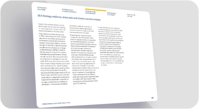03.4 Strategy resilience, stress tests and climate scenario analysis 01 Introduction and strategy 02 Measuring and managing sustainability 03 Climate change related disclosure 04 Str engthening our foundation 05 Our universal principles Impacts from extreme weather events are not taken into account for simplicity, i.e., net temperature increase is the sole hazard considered in the assessment. Major drivers of climate change risks for P&C underwriting are acute phy sical risks, which materialize as increases in the frequency and severity of extreme weather events attributable to climate change. For the P&C underwriting stress module we hence focused on changes in best-estimate liabilities for NatCat risk exposures that result from relative increases of projected losses in climate change scenarios. The assessment relies on projections for Average Annual Loss under RCP scenarios for a selection of the most climate-change relevant country and peril combinations (i.e. inland flooding, excluding Australia, and tropical cyclone) from the Allianz Climate Change Risk Solutions (ACCRiS) project (section 02.1.3). The inclusion of further country and p eril combinations is expected to increase the impact of the assessment. Note that no changes in best-estimate liabilities for windstorms in Europe are considered as scientific studies do currently not indicate a clear signal regarding an incr ease in climate change associated loss expectations for this peril. To separate the impact of climate change risk from trend gro wth, stress levels are assessed relative to a baseline or counterfactual scenario, which are basically hypothetical variable pathways that would be expected in the absence of climate change. Furthermore, the calculation of stress impacts is based on instantaneous stresses on the static year end 2022 balance sheet, without adaptation or mitigation actions from Allianz and its business partners. In particular, internal measures such as contract repricing, deployment of reinsurance strategies, or portfolio steering have not been taken into account, as well as external measures such as public investment in flood defences. Impact estimates from the different stress test modules are integrated based on simple matching of global mean temperature pathways between NGFS and IPCC scenarios. Impact estimates from the integrated climate change stress test rely on sc enario data that is available and considered relevant as of the current point in time. Nevertheless, the magnitude of outcomes has to be taken with a pinch of salt when accounting for the significant uncertainties inherent to climate change modeling and the crucial role of assumptions in long-term projections. This notably includes the uncertainty and variation of scientific studies underlying the forecasted distributions of NatCat events, which we address by considering a broad body of scientific research as well as benchmarking of different models, and assumptions for the counterfactual scenario, which have a critical impact on results. Allianz Group Sustainability Report 2022 110