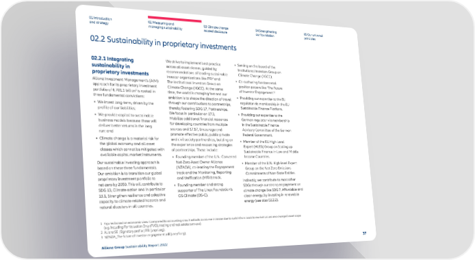 01 Introduction and strategy 02 Measuring and managing sustainability 03 Climate change related disclosure 04 Strengthening our foundation 05 Our universal principles 02.2 Sustainability in proprietary investments 02.2.1 Integrating sustainability in proprietary investments Allianz Investment Management’s (AIM) approach for its proprietary investment portfolio of € 701.1 billion 1 is rooted in three fundamental convictions: • We invest long-term, driven by the profile of our liabilities; • We provide capital to sustainable business models because these will deliver better returns in the long run; and • Climate change is a material risk for the global economy and all asset classes which cannot be mitigated with available capital market instruments. Our sustainable investing approach is based on these three fundamentals. Our ambition is to transition our global proprietary investment portfolio to net-zero by 2050. This will contribute to SDG 13, Climate action and in particular 13.1, Strengthen resilience and adaptive capacity to climate-related hazards and natural disasters in all countries. We strive to implement best practice across all asset classes, guided by recommendations of leading sustainable investor organizations like PRI 2 and The Institutional Investors Group on Climate Change (IIGCC). At the same time, the world is changing fast and our ambition is to shape the direction of travel through our contributions to partnerships, thereby fostering SDG 17, Partnerships. We focus in particular on 17.3, Mobilize additional financial resources for developing countries from multiple sources and 17.17, Encourage and promote effective public, public-private and civil society partnerships, building on the experience and resourcing strategies of partnerships. These include: • Founding member of the U.N.-Convened Net-Zero Asset Owner Alliance (NZAOA), co-leading the Engagement track and the Monitoring, Reporting and Verification (MRV) track. • Founding member and strong supporter of The Linux Foundation’s OS Climate (OS-C). • Serving on the board of the Institutional Investors Group on Climate Change (IIGCC). • Co-authoring fundamental position papers like ‘The Future of Investor Engagement.’ 3 • Providing our expertise to the EU regulator via membership in the EU Sustainable Finance Platform. • Providing our expertise to the German regulator via membership in the Sustainable Finance Advisory Committee of the German Federal Government. • Member of the EU High-Level Expert (HLEG) Group on Scaling up Sustainable Finance in Low and Middle Income Countries. • Member of the U.N. High-level Expert Group on the Net-Zero Emissions Commitments of Non-State Entities. Indirectly, we contribute to most other SDGs through our strong engagement on climate change like SDG 7, Affordable and clean energy, by investing in renewable energy ( see also 02.2.2 ). 1 Figures based on economic view. Compared to accounting view it reflects a volume increase due to switch from book to market values and changed asset scope (e.g. including For Valuation Only (FVO), trading and real estate own-use). 2 Allianz SE | Signatory profile | PRI (unpri.org) . 3 NZAOA_The-future-of-investor-engagement.pdf (unepfi.org) . A llianz Gr oup Sustainability R ep or t 2022 37
