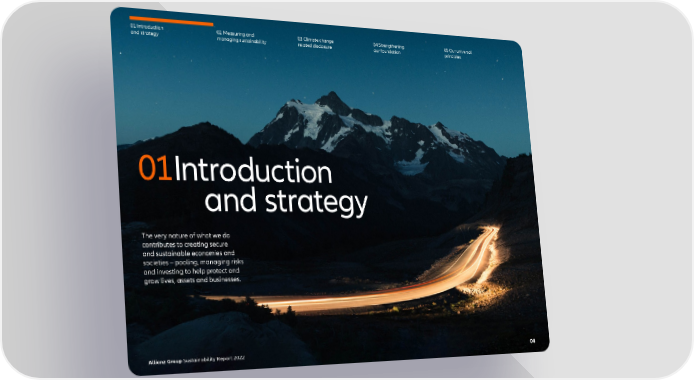 01 Introduction and strategy 02 Measuring and managing sustainability 03 Climate change related disclosure 04 Strengthening our foundation 05 Our universal principles 01 Introduction and strategy The very nature of what we do contributes to creating secure and sustainable economies and societies – pooling, managing risks and investing to help protect and grow lives, assets and businesses. Allianz Group Sustainability Report 2022 04