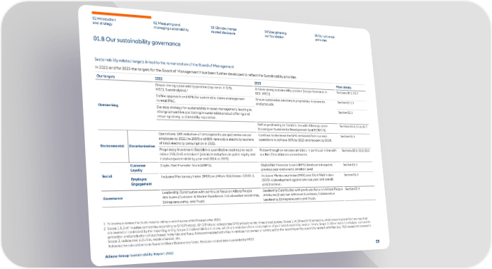 01.8 Our sustainability governance 01 Introduction and strategy 02 Measuring and managing sustainability 03 Climate change related disclosure 04 Strengthening our foundation 05 Our universal principles Sustainability-related targets linked to the remuneration of the Board of Management In 2022 and for 2023 the targets for the Board of Management have been further developed to reflect the Sustainability priorities. Our targets 2022 2023 More details Overarching Ensure strong sustainability position (top ranks in DJSI, MSCI, Sustainalytics). 1 Achieve strong sustainability position (top performance in DJSI, MSCI). Sections 05.1 ; 05.2 Define approach and KPIs for sustainable claims management in retail P&C. Ensure sustainable solutions in proprietary investments and products. Section 02.1.3 Develop strategy for sustainability in asset management, leading to strong competitive positioning in sustainable product offering and ensuring strong sustainability reputation. Section 02.3 Define positioning on Social in line with Allianz purpose focusing on Sustainable Development Goal 8 (SDG 8). Sections 01.4 ; 01.6 ; 02.7 Environmental Decarbonisation Operations: 18% reduction of GHG (greenhouse gas) emissions per employee by 2022 (vs 2019) and 88% renewable electricity as share of total electricity consumption in 2022. Continue to decrease the GHG emissions from our own operations to achieve -50% by 2025 and net-zero by 2030. Section 02.6 Proprietary Investment: Establish a quantitative roadmap to reach minus 25% GHG emissions 2 (absolute reduction on public equity and listed corporate debt by year-end 2024 vs 2019). Follow through on net-zero ambition, in particular in line with our Net-Zero Alliances commitments. Sections 02.1 ; 02.2 ; 03.3 Social Customer Lo yalty Digital Net Promoter Score (dNPS). Digital Net Promoter Score (dNPS) development against previous year and overall ambition level. Section 02.5 Employee Engagement Inclusive Meritocracy Index (IMIX) and Work Well Index+ (WWI+). Inclusive Meritocracy Index (IMIX) and Work Well Index+ (WWI +) development against previous year and overall ambition level. Section 02.4 Governance Leadership Contribution with particular focus on Allianz People Attributes (Customer & Market Excellence, Collaborative Leadership, Entrepreneurship, and Trust). Leadership Contribution with particular focus on Allianz People Attributes (Customer & Market Excellence, Collaborative Leadership, Entrepreneurship and Trust). Section 02.4 1 Following a review, the Sustainalytics rating is out of scope of BoM target after 2022. 2 Scope 1 & 2 of investee companies according to GHG Protocol. GHG Protocol categorizes GHG emissions into three broad scopes: Scope 1: All Direct GHG emissions, which are emissions from sources that are owned or controlled by the reporting entity, Scope 2: Indirect GHG emissions, which are emissions from consumption of purchased electricity, heat or steam, Scope 3: Other indirect emissions, such as the extraction and production of purchased materials and fuels, transport-related activities in vehicles not owned or controlled by the reporting entity, electricity related activities (e.g. T&D losses) not covered in Scope 2, outsourced activities, waste disposal, etc. Reference for calculation to be found in Allianz Explanatory Notes . Emission-related data is provided by MSCI. 23 Allianz Group Sustainability Report 2022