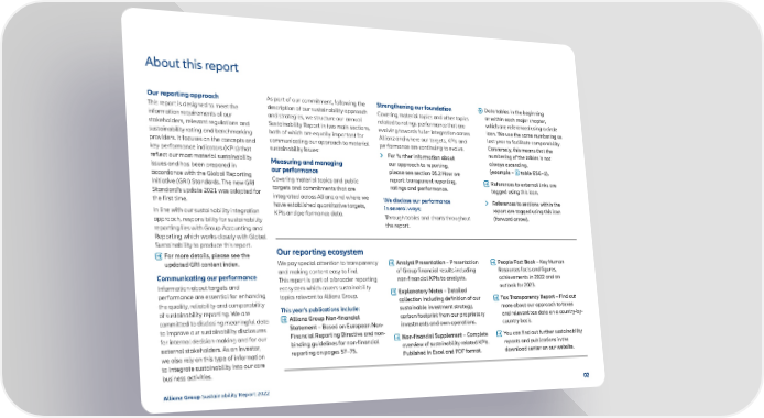 Allianz Group Sustainability Report 2022 (,i:) (,i:) [fl A [fl [fl [fl A [fl [fl [fl [fl [fl About this report Our reporting approach This report is designed to meet the information requirements of our stakeholders, relevant regulations and sustainability rating and benchmarking providers. It focuses on the concepts and key performance indicators (KPIs) that reflect our most material sustainability issues and has been prepared in accordance with the Global Reporting Initiative (GRI) Standards. The new GRI Standard’s update 2021 was adopted for the first time. In line with our sustainability integration approach, responsibility for sustainability reporting lies with Group Accounting and Reporting which works closely with Global Sustainability to produce this report. For more details, please see the updated GRI content index. Communicating our performance Information about targets and performance are essential for enhancing the quality, reliability and comparability of sustainability reporting. We are committed to disclosing meaningful data to improve our sustainability disclosures for internal decision-making and for our external stakeholders. As an investor, we also rely on this type of information to integrate sustainability into our core business activities. As part of our commitment, following the description of our sustainability appr oach and strategies, we structure our annual Sustainability Report in two main sections, both of which are equally important for communicating our approach to material sustainability issues: Measuring and managing our performance Covering material topics and public targets and commitments that are integrated across Allianz and where we have established quantitative targets, KPIs and performance data. Strengthening our foundation Covering material topics and other topics related to ratings performance that are evolving towards fuller integration across Allianz and where our targets, KPIs and performance are continuing to evolve. For further information about our approach to reporting, please see section 05.2 How we report: transparent reporting, ratings and performance. We disclose our performance in se veral ways: Through tables and charts throughout the r eport. Data tables in the beginning or within each major chapter, which are referenced using a circle icon. We use the same numbering as last year to facilitate comparability. Conversely, this means that the numbering of the tables is not always ascending. (example – table ESG–1). References to external links are tagged using this icon. References to sections within the report are tagged using this icon (forward arrow). Our reporting ecosystem We pay special attention to transparency and making content easy to find. This report is part of a broader reporting ecosystem which covers sustainability topics relevant to Allianz Group. This year’s publications include: Allianz Group Non-financial Statement – Based on European Non- Financial Reporting Directive and non- binding guidelines for non-financial reporting on pages 57–75. Analyst Presentation – Presentation of Group financial results including non-financial KPIs to analysts. Explanatory Notes – Detailed collection including definition of our sustainable investment strategy, carbon footprint from our proprietary investments and own operations. Non-financial Supplement – Complete overview of sustainability-related KPIs. Published in Excel and PDF format. People Fact Book – Key Human Resources facts and figures, achievements in 2022 and an outlook for 2023. Tax Transparency Report – Find out more about our approach to taxes and relevant tax data on a country-by- country basis. You can find out further sustainability reports and publications in the download center on our website. 02