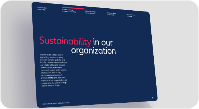 01 Introduction and strategy 02 Measuring and managing sustainability 03 Climate change related disclosure 04 Strengthening our foundation 05 Our universal principles Sustainability in our organization We aim to be sustainable in everything we do and every decision we take globally and locally. This commitment shapes our relationships and impacts on employees, customers, communities and wider society. We focus on measuring and managing the social, environmental and economic impacts of our organization on people and the planet to help deliver the U.N. SDGs. Allianz Group Sustainability Report 2022 56