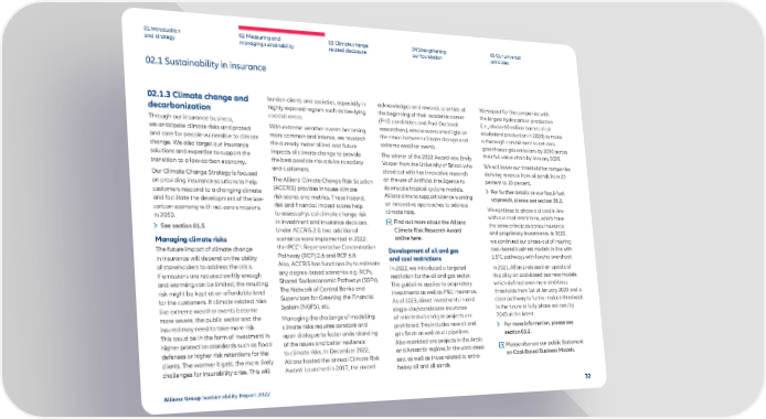 01 Introduction and strategy 02 Measuring and managing sustainability 03 Climate change related disclosure 04 Strengthening our foundation 05 Our universal principles 02.1 Sustainability in insurance 02.1.3 Climate change and decarbonization Through our insurance business, we anticipate climate risks and protect and care for people vulnerable to climate change. We also target our insurance solutions and expertise to support the transition to a low-carbon economy. Our Climate Change Strategy is focused on providing insurance solutions to help customers respond to a changing climate and facilitate the development of the low- carbon economy with net -zero emissions in 2050. See section 01.5. Managing climate risks The future impact of climate change in insurance will depend on the ability of stakeholders to address the crisis. If emissions are reduced swiftly enough and warming can be limited, the resulting risk might be kept at an affordable level for the customers. If climate-related risks like extreme weather events become more severe, the public sector and the insured may need to take more risk. This could be in the form of investment in higher protection standards such as flood defenses or higher risk retentions for the clients. The warmer it gets, the more likely challenges for insurability arise. This will burden clients and societies, especially in highly exposed regions such as low-lying coastal areas. With extreme weather ev ents b ecoming more common and intense, we research the already materialized and future impacts of climate change to provide the best possible risk advic e to so ciety and customers. The Allianz Climate Change Risk Solution (ACCRiS) provides inhouse climate risk scores and metrics. These hazard, risk and financial impact scores help to assess physical climate change risk in in vestment and insurance decisions. Under ACCRiS 2.0, two additional scenarios were implemented in 2022: the IPCC’s Representative Concentration Pathway (RCP) 2.6 and RCP 6.0. Also, ACCRiS has functionality to estimate any degree-based scenarios e.g. RCPs, Shared Socioeconomic Pathways (SSPs), The Network of Central Banks and Supervisors for Greening the Financial System (NGFS), etc. Managing the challenge of modelling climate risks requires constant and open dialogue to foster understanding of the issues and better resilience to climate risks. In December 2022, Allianz hosted the annual Climate Risk A ward. Launched in 2017, the award acknowledges and rewards scientists at the beginning of their academic career (PhD candidates and Post-Doctoral researchers), whose works shed light on the nexus b etween climate change and extreme weather events. The winner of the 2022 Award was Emily Vosper from the University of Bristol who stood out with her innovative research on the use of Artificial Intelligence to downsc ale tropical cyclone models. Allianz aims to support science working on innovative approaches to address climate risks. Find out more about the Allianz Climate Risk Research Award online here. Development of oil and gas and coal restrictions In 2022, we introduced a targeted restriction for the oil and gas sector. The guideline applies to proprietary investments as well as P&C insurance. As of 2023, direct investments in and single-site/standalone insurance of selected oil and gas projects are prohibited. This includes new oil and gas fields as well as oil pipelines. Also restricted are projects in the Arctic and Antarctic regions, in the ultra-deep sea, as well as those related to extra- heavy oil and oil sands. We expect for the companies with the largest hydrocarbon production (i.e., above 60 million b arr els of oil equivalent production in 2020) to make a thorough commitment to net-zero greenhouse gas emissions by 2050 across their full value chain by January 2025. We will lower our threshold for companies deriving revenue from oil sands from 20 percent to 10 percent. For further details on our fossil-fuel approach, please see section 03.2. We continue to phase out coal in line with our coal restrictions, which have the same principles across insurance and proprietary investments. In 2022, we continued our phase-out of insuring c oal-based business models in line with 1.5°C pathways with low/no overshoot. In 2021, Allianz released an update of its policy on coal-based business models which defined even more ambitious thresholds from 1st of January 2023 and a clear pathway to further r educe thresholds in the future to fully phase out coal by 2040 at the latest. For more information, please see section 03.2. Please also see our public Statement on Coal-Based Business Models. A llianz Gr oup Sustainability R ep or t 2022 32