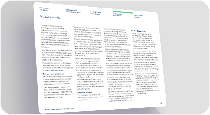 01 Introduction and strategy 02 Measuring and managing sustainability 03 Climate change related disclosure 04 Strengthening our foundation 05 Our universal principles Through privacy reviews, every operating entity, global line and regional office is required to undergo a rigorous examination of the design, implementation and effectiveness of their local privacy program and related process and controls. Frequency of these reviews is determined based on risk but are undertaken no less than once every five years. As of the end of 2022, we have conducted 16 privacy reviews including a joint review with Information Security. For comparison, 14 and 11 reviews were undertaken in 2021 and 2020 respectively. Privacy deficiencies and audit findings are tracked in a global database and, if necessary, escalated to top management to ensure timely remediation. Privacy risk management We identify and manage privacy risks at the operational process level to ensure they are measured, monitored and mitigated across our core businesses. PIAs of processes that use personal data – such as customer health data and employee data – enable the early identification of risks and ensure they are managed appropriately. We are also committed to ensuring that adequate and effective controls are in place to address data privacy risks associated with the processing of personal data by external suppliers on behalf of Allianz. Following the Data Protection Commissioner v. Facebook Ireland Limited, Maximillian Schrems (‘Schrems II’) decision, we have undertaken case-by-case Transfer Impact Assessments (TIAs) for processes that transfer personal data from the European Economic Area (EEA) to suppliers in third countries. In 2022, we designed a TIAs template in our privacy management platform. The TIAs template will be rolled out to all our operating entities in the EEA to ensure such assessments are conducted in a consistent, semi-automated way. This does not replace existing compliance requirements under the APS to conduct PIAs. Rather, the TIAs template is a tool to supplement existing data privacy compliance efforts and help operating entities ensure an adequate level of data protection is maintained when personal data is transferred. Employee training Our employees play a critical role in upholding our commitment to protect personal data. To ensure they have the knowledge to properly use and safeguard personal data, we continue to develop our robust privacy training program. This includes annual online trainings and awareness activities for all employees, as well as tailored trainings for employees with privacy management responsibilities and for our Privacy Champions. All employees are required to complete annual privacy training which covers the Allianz Privacy Framework requirements in detail and ensures a solid foundational understanding of core privacy concepts and the proper handling of personal data. Ongoing awareness activities (panels and events) and communication campaigns (bi-monthly newsletter, intranet videos and articles) provide guidance on ad hoc topics like how to securely work and be privacy compliant in a hybrid environment. For Privacy Experts, five-day Privacy Expert Training is focused on providing Data Protection Professionals and Data Protection Officers with the practical knowledge to effectively conduct their day-to-day activities. For Privacy Champions, two-day Privacy Champion Training is focused on the practical knowledge and exercises of the Privacy Champion role to ensure data protection compliance within the business. 04.1.3 Data ethics Our aim is to maintain stakeholder trust and position Allianz as a leader in conducting data-driven business in a trustworthy and ethical manner. This includes elevating data ethics and selected data and analytics-related topics in the governance and decision-making processes of Allianz Group. We strive for a responsible use of Artificial Intelligence (AI) in our business activities based on a strong AI Governance framework. This includes ensuring a human centric approach in our usage of AI systems. Ensuring compliance with current and upcoming regulations and embedding best practices in anticipation of regulatory change are also high priorities in fulfilling our data ethics commitments. At EU level, relevant legislation includes the GPDR and the upcoming AI Act which could significantly broaden the scope of regulation. Working in a cross-functional manner – especially between Group Privacy and Group Data Analytics – to ensure compliant, technically feasible implementation of regulatory requirements enables both Privacy and Ethics by Design. 04.1 Cybersecurity Allianz Group Sustainability Report 2022 122