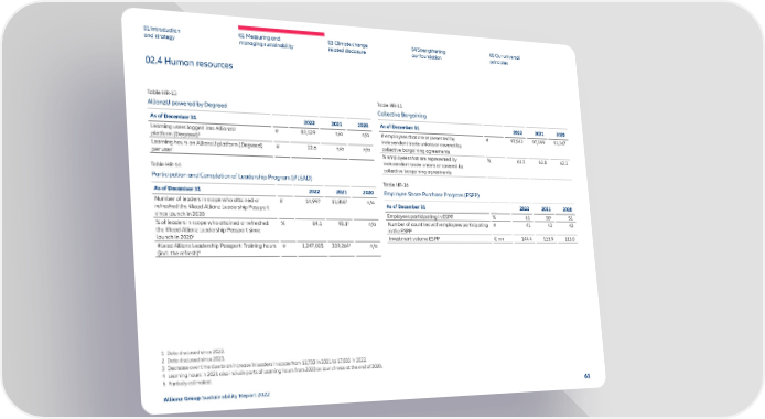 01 Introduction and strategy 02 Measuring and managing sustainability 02.4 Human resources 03 Climate change related disclosure 04 Strengthening our foundation 05 Our universal principles Table HR-13 AllianzU powered by Degreed As of December 31 2022 2021 2020 Learning users logged into AllianzU platform (Degreed) 1 # 83,529 n/a n/a Learning hours on AllianzU platform (Degreed) per user 1 # 22.6 n/a n/a Table HR-14 Participation and Completion of Leadership Program (#LEAD) As of December 31 2022 2021 2020 Number of leaders in scope who attained or refreshed the #lead Allianz Leadership Passport since launch in 2020 # 14,997 11,850 2 n/a % of leaders in scope who attained or refreshed the #lead Allianz Leadership Passport since launch in 2020 3 % 84.1 93.1 2 n/a #Lead Allianz Leadership Passport: Training hours (incl. the refresh) 4 # 1,247,025 339,264 2 n/a Table HR-15 Collective Bargaining As of December 31 2022 2021 2020 # employees that are represented by independent trade unions or covered by collective bargaining agreements # 97,542 97,599 93,247 % employees that are represented by independent trade unions or covered by collective bargaining agreements % 61.2 62.8 62.1 Table HR-16 Employee Share Purchase Program (ESPP) As of December 31 2022 2021 2020 Employees participating in ESPP % 61 50 5 51 Number of countries with employees participating in the ESPP # 41 42 42 Investment volume ESPP € mn 144.4 133.9 113.0 1 Data disclosed since 2022. 2 Data disclosed since 2021. 3 Decrease over time due to an increase in leaders in scope from 12,733 in 2021 to 17,833 in 2022. 4 Learning hours in 2021 also include parts of learning hours from 2020 as launch was at the end of 2020. 5 Partially estimated. Allianz Group Sustainability Report 2022 61