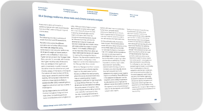 03.4 Strategy resilience, stress tests and climate scenario analysis 01 Introduction and strategy 02 Measuring and managing sustainability 03 Climate change related disclosure 04 Strengthening our foundation 05 Our universal principles Assessments were performed in a workshop format with various participants from local P&C underwriting, pricing and claims areas. Results The following provides a summary of results from the local OE assessments. Transition risks under the different scenarios can be further differentiated into three sub-categories: policy, technological and consumer preferences. All three will weigh on future premium growth and profitability in retail motor. Higher carbon prices in the ‘Divergent Net- Zero scenario’, for example, will translate into higher mobility costs. At the same time, we anticipate that significant public investments in public transport should increase the attractiveness, and thereby usage, of this means of transport. Consumers will react to these shifts by reducing car ownership and individual mobility. While modest in the short- to mid-term, these trends are likely to accelerate after 2030, translating into a negative outlook on business volumes in the long-run. Survey respondents also confirmed that technological change will be a main driver for declining profits in motor retail business due to higher loss ratios. Although claims frequency might decline thanks to better technologies, this is more than offset by an increase in severity, meaning higher costs for repairs and spare parts. Over the long-term these developments should be reflected in pricing, such that the adverse technological impacts will become increasingly less material before ultimately achieving a state of neutral impact. In this respect, differences in survey responses reflect how advanced respondents see themselves with respect to insuring EVs, among other factors. Physical risks like extreme weather events are assessed as having only a minor impact on claims in the motor business in the ‘Divergent Net-Zero scenario’. While the ‘Divergent Net-Zero’ scenario is expected to have a clearly negative impact on the retail motor business the story is different for retail property, where the survey revealed mixed views. Here, an overall positive impact is expected, in particular for top-line growth, i.e. Gross Written Premium. The main drivers are new standards for buildings (the policy aspect of transition risks), which require corresponding insurance cover and offer new opportunities, but also increasing demand due to growing risk awareness, especially in markets with lower insurance penetration. Furthermore, increased natural catastrophes (NatCat)risks are likely to lead to a greater level of risk aversion or consumer desire for protection, which in turn will translate into higher premiums. On the profitability side, the picture is more nuanced. More extreme weather events will lead to rising claims, but pricing and portfolio steering should be able to neutralize the impact on the bottom line. In this context, technical excellence was seen as a strong competitive advantage over the short- to mid-term by one respondent, supporting a rather positive view on profitability. For other respondents, however, higher claims associated with new building materials and technology as well as limitations around pricing adjustments (e.g. tacit renewals) lead to the assessment of a neutral or even negative impact on profitability. These differences in the assessments disappear over the long-term, where pricing is expected to be adapted, but serve to highlight the different market characteristics as well as the degree of uncertainty and divergent views on risk development, even amongst subject matter experts. Turning to the scenario ‘Current Policies’, the assessments are mostly similar, albeit with transition impacts being viewed as generally less severe, especially over the short- to mid-term time horizon. As policies stay more or less unchanged, the trends of less individual mobility and more climate-efficient buildings will unfold more slowly. Therefore, the qualitative risk assessment expects almost no net change in the business environment until 2030. Only after this will the full impact of these trends be felt. Mixed views prevail for retail motor, where survey respondents weigh the various impacts from market growth, increasing physical risks and competition very differently. For retail property, most respondents assessed negative impacts on profitability from increasing physical risks and competition over the short- to mid-term, which served as the primary driver for the overall assessment result. Over the long-term, this is further aggravated by potential issues around insurability, reinsurance capacity and government intervention preventing proper price adjustments, with the exception of one response, which assigns a higher weight to increasing demand and acceptance of risk based pricing. Allianz Group Sustainability Report 2022 108